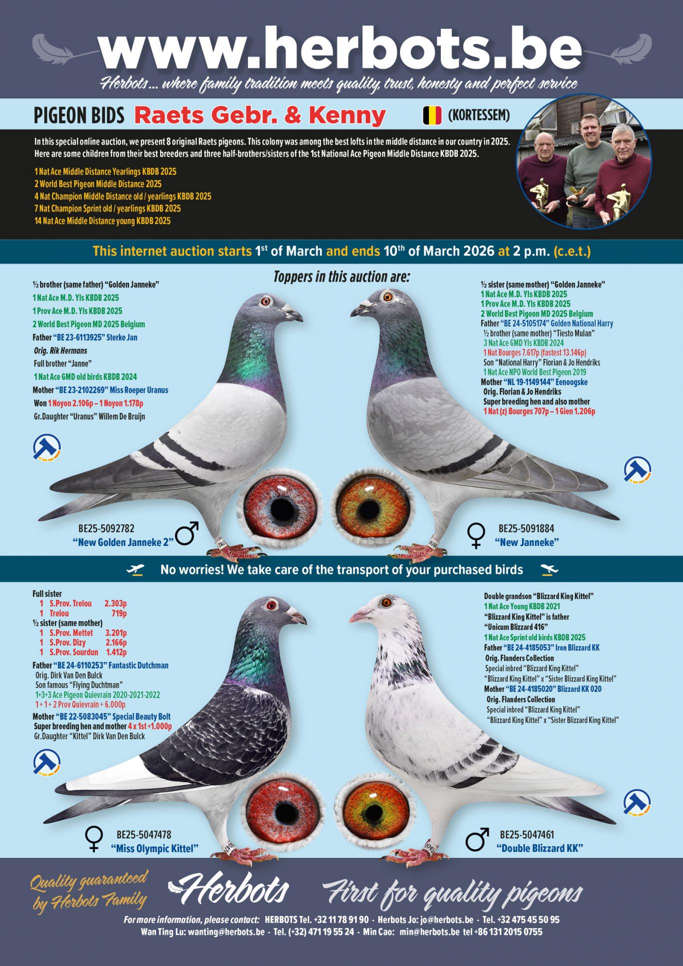 In het Limburgse Kortessem komen we terecht bij de Raets kolonie, deze bestaat uit vader Arnoud en zoon Kenny die samen met hun nonkel Jean Marie samen de krachten bundelen om op hoog niveau mee te strijden met de besten. Want dat is ook nodig als je wil meedoen op provinciaal en nationaal niveau met de beste kolonies. Nu in 2025 hebben ze alweer een 1ste Nationale Asduif halve fond met “Golden Janneke”, deze stunt hadden ze ook beleefd in 2018. Dit was toen met de oude duiven op de halve fond en in 2017 wonnen ze ook al de harde “Gouden Duif” competitie. Nu in 2025 staan ze wel tussen meerdere nationale kampioenschappen waarin hun focus dus vooral ligt met de oude en jaarlingen.