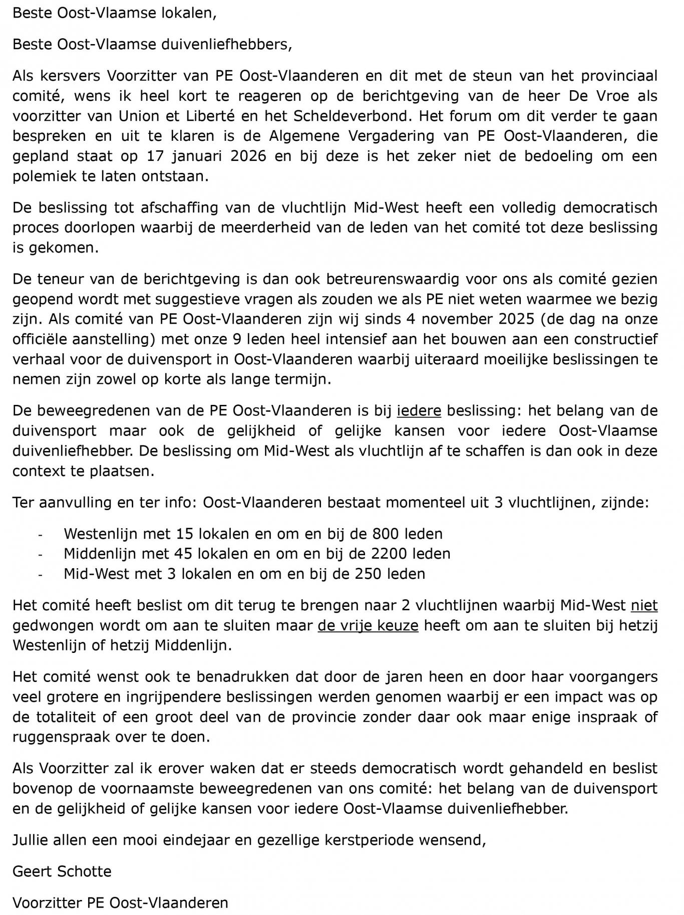 Naar aanleiding van de berichtgeving van de heer De Vroe, die wij nu zien verschijnen via diverse 'duiven'-kanalen, had ik graag samen met het comité PE Oost-Vlaanderen het bijgevoegde korte antwoord laten publiceren.