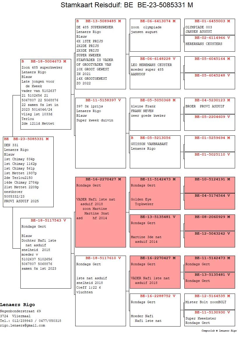De eerste vlucht voor de kolonie van Rigo Lenaers is fantastische begonnen. Zowel doffers als duivinnen gingen de mand in, enkel de jaarling doffers bleven nog thuis. Er werden 6 duiven gelijk geklokt in 12 seconden en dit waren de 6 snelste van bijna 2.000 duiven. Voor Rigo een fantastische start na zijn superseizoen van vorig jaar. De eerste duif is een doffer en is een zoon van Rigo zijn beste koppel, de tweede duif is jaarling duivin. Deze is een laatje dat vorig jaar 7 keer de korf inging en ook toen al mooie dingen liet zien. Verder zijn zo goed als alle duiven nakomelingen van stamvader “Super 485” die een kleinzoon is van “Olympiade 003” Leo Heremans
