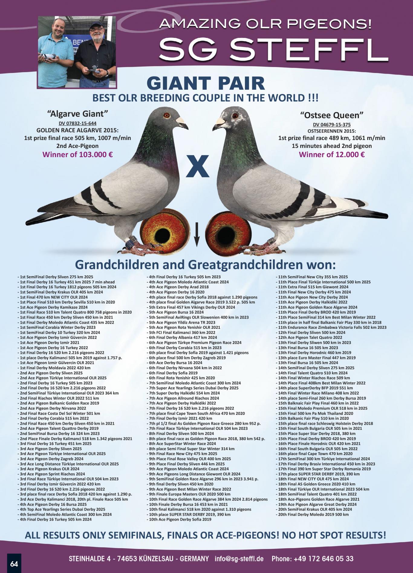 Het hok van Duitse kampioenen Steffl (SG Steffl) is gevestigd in het landelijke dorp Künzelsau in Zuid-Duitsland. De leden van SG Steffl zijn Franz (65 jaar), Martin (44 jaar), Hannes (11 jaar) en Jan (9 jaar). Al zo'n 20 jaar behoort SG Steffl tot de top van de Duitse duivensport. Ook internationaal hebben ze naam gemaakt, met name door hun uitstekende successen op de One Loft Races en hun nominaties op diverse Olympiades.