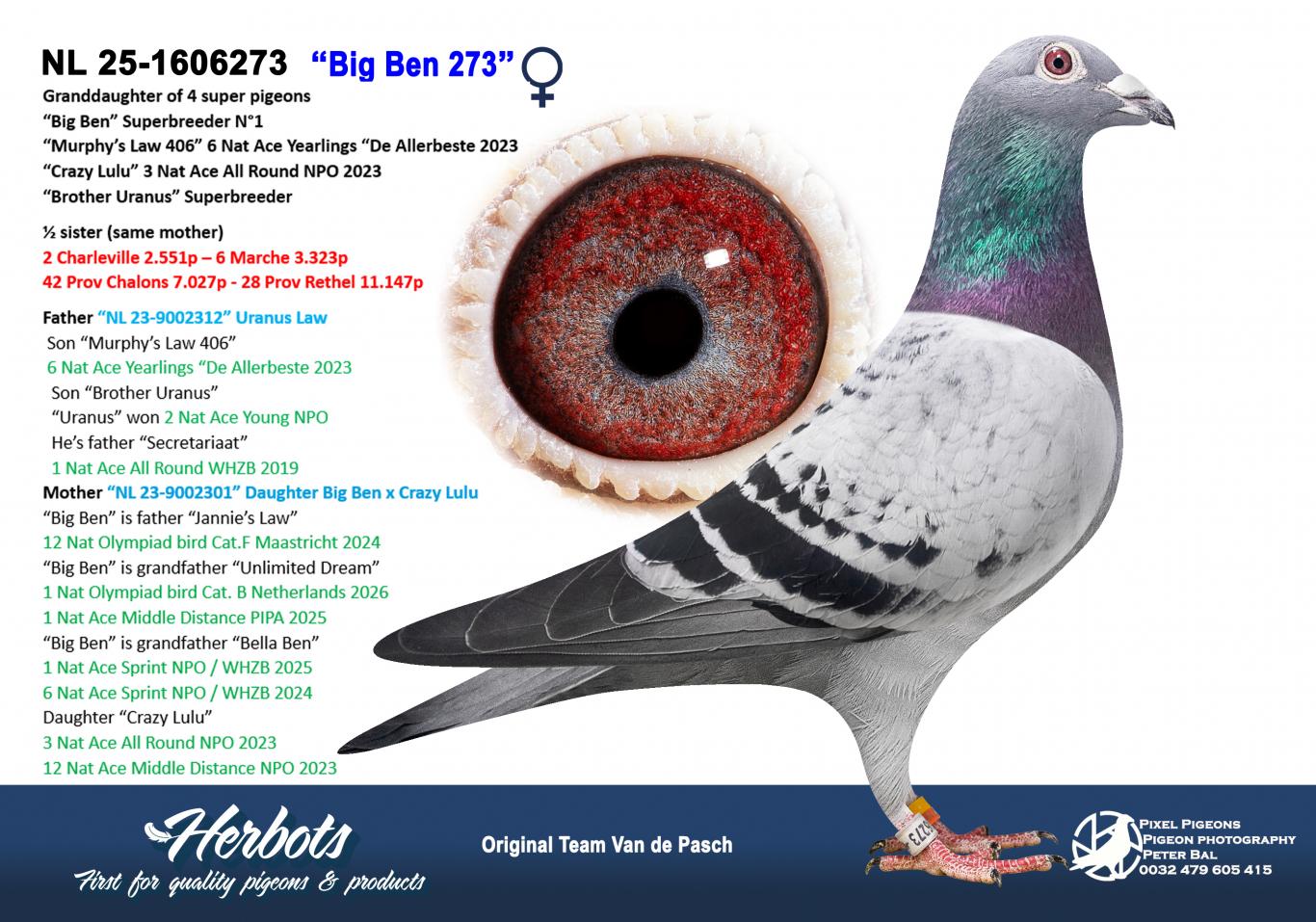 De olympiadeduiven ten huize Van de Pasch zijn sowieso al de meeste uit de geschiedenis van heel de Nederlandse duivensport. Het record staat op hun naam en daar voegen ze komende winter weer ééntje aan toe. Hun “Unlimited Dream” wordt 1 Nat Olympiadeduif Nederland halve fond 2026. Deze topduivin wordt ook nog 1 Nat Asduif Nederland halve fond PIPA 2025. Daarnaast hebben de opvolgster van “No Limit” gevonden, hun “Bella Ben” brengt een nieuwe asduiftitel op de snelheid naar Grubbenvorst. Deze duivin wint 1 Nat Asduif snelheid Npo / WHZB 2025 en werd vorig jaar al tevens 6de Nat Asduif snelheid Npo / WHZB 2024. Een wonderduivin in de hand en in de lucht die nu het ijzersterke kweekhok mag gaan versterken. Op de tweede plaats vinden we nog een Van de Pasch duifje in deze rankings, deze zit bij Wim Van de Pasch en is een originele duif van Team Van de Pasch die zilver behaalt. Ook deze duivin komt naar het kweekhok waar de toekomst alleen maar sterker van zal worden.
