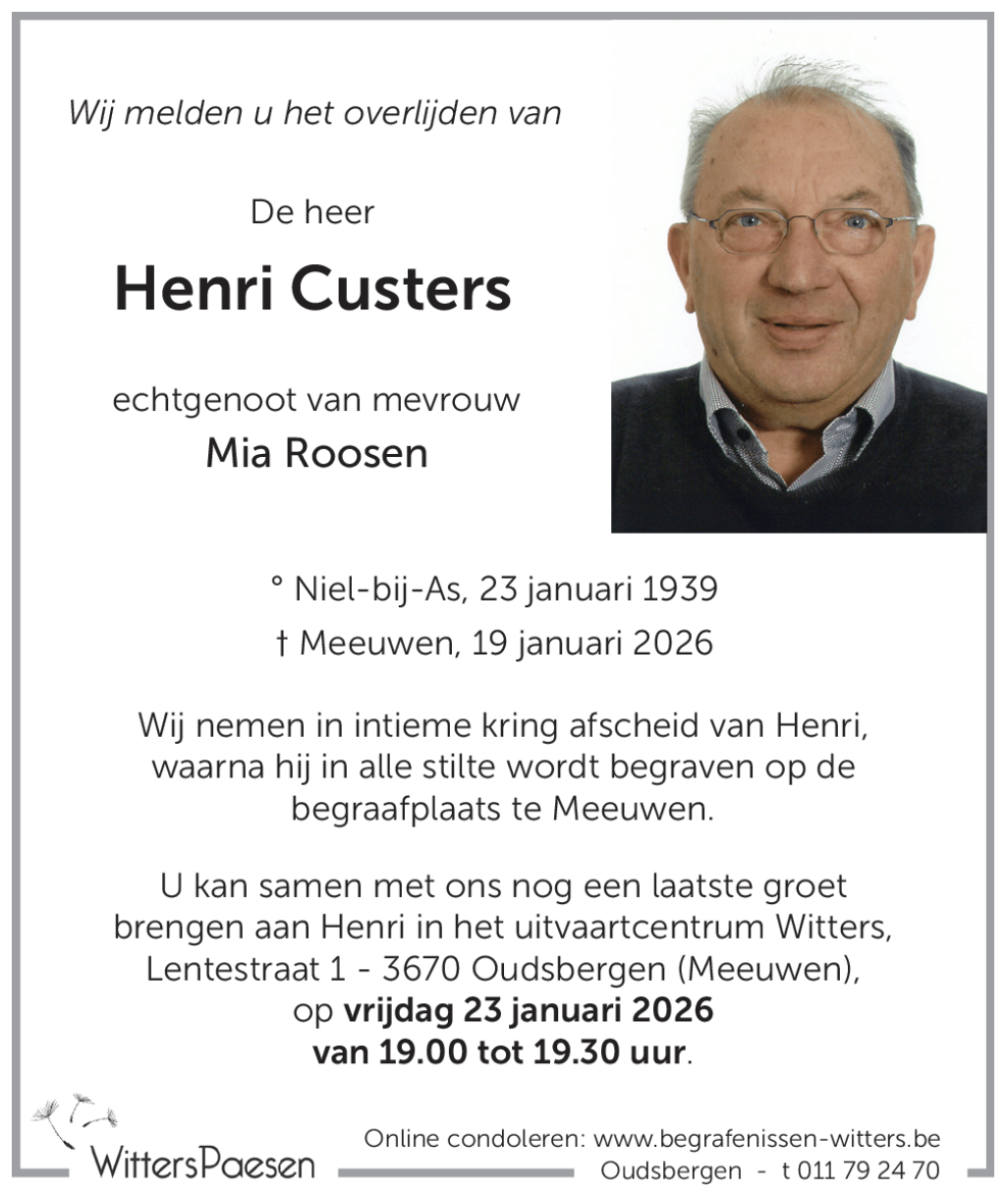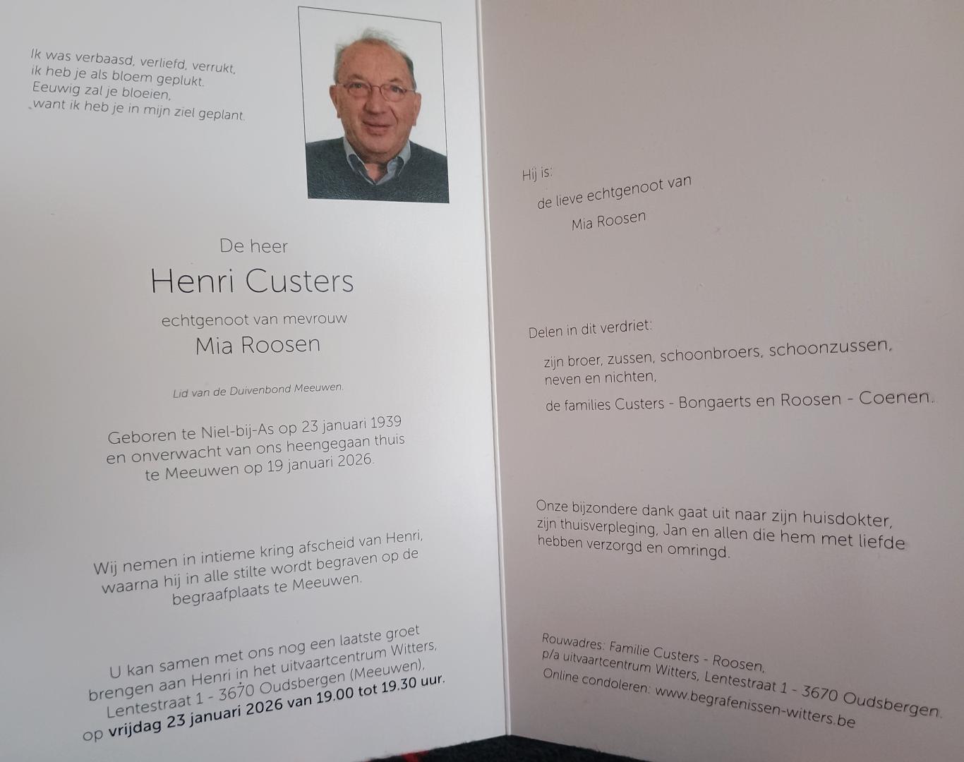 In de nacht van zondag 18 januari op maandag 19 januari is Henri Custers van ons heengegaan.