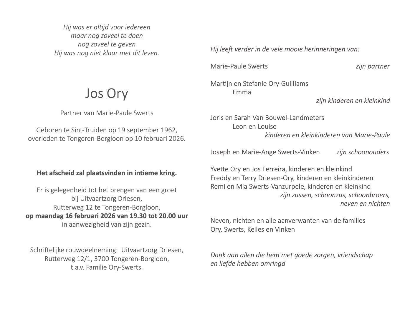 Met verdriet delen wij het nieuws dat Jos Ory dinsdag is overleden.