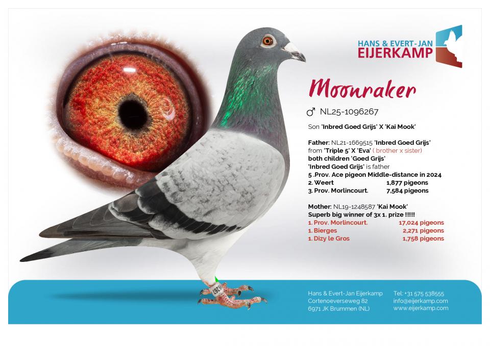 Born out “Triple 5” (son “Goed Grijs”) x “Eva” (4th Nat. ace NPO short distance 2019 – descendants are winning 1st Olympiad bird Cat. G. 2023 – 1st Nat. ace middle distance World Best Pigeon ’23 – 2nd Nat. ace youngbirds Pipa Ranking)