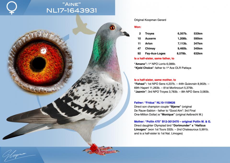 Direct daughter Olympiad bird “Dortmunder” x “Halfzus Limoges” (won 1st Tours 332b. – 2nd Chateauroux 5,991b., and is a half-sister to 1st Nat. Limoges)