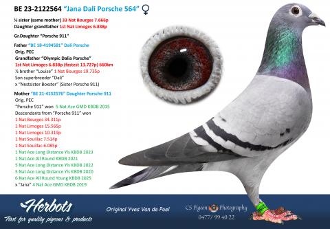 In deze speciale internetverkoop van Yves Van de Poel brengen we de eerste kinderen van de nationale winnares Limoges, nl. “Olympic Dalia Porsche” die hier speciaal gekoppeld werden tegen de allerbeste duiven uit “Porsche 911” PEC. Yves heeft in deze duiven geïnvesteerd en meerdere kleinkinderen van superkweker “Porsche 911” zullen hier worden aangeboden samen met een kind uit de grootvader “Dali Porsche” en moeder “Argo Porsche” van de nationale winnares van Limoges.