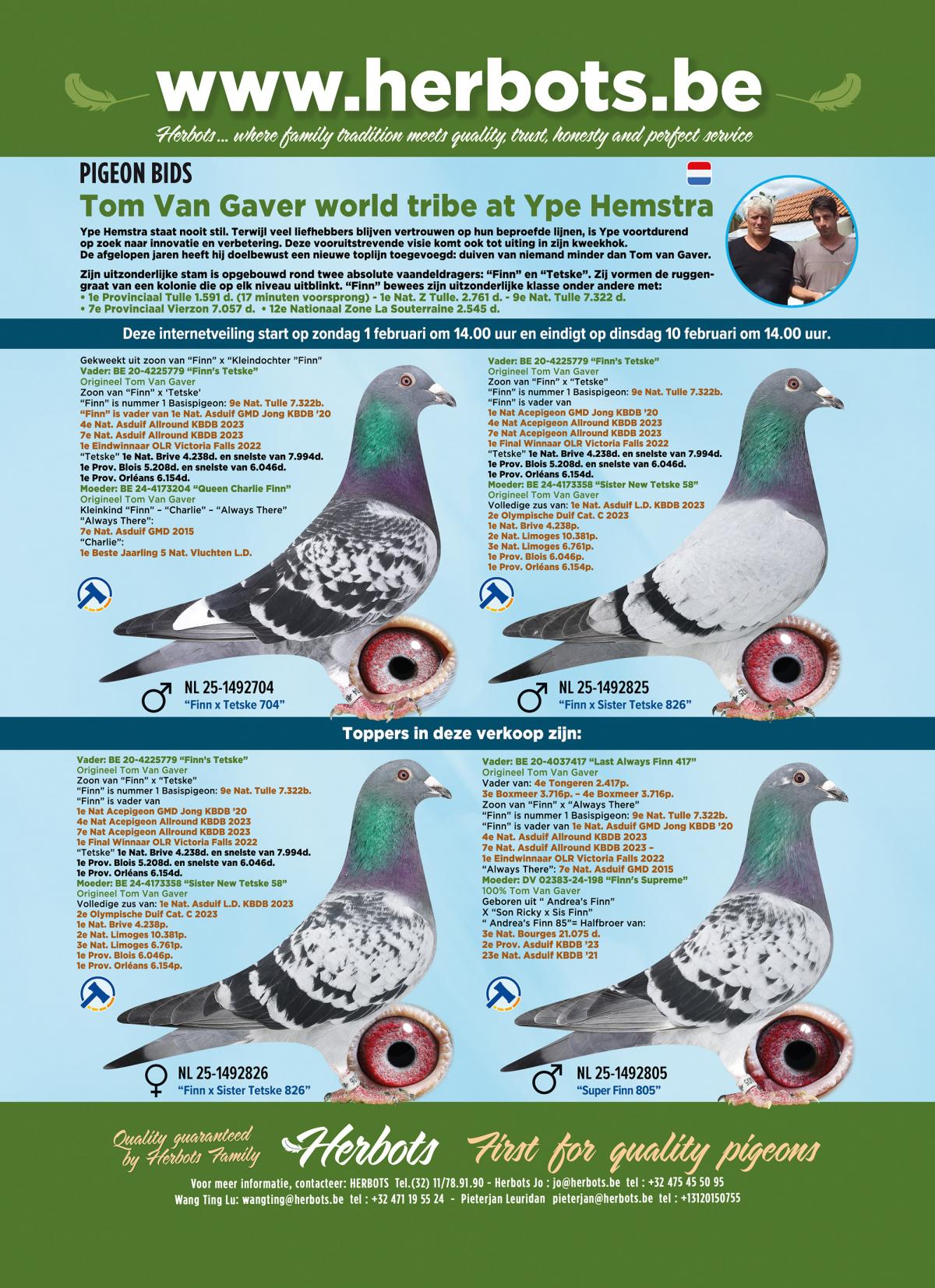 Ype Hemstra staat nooit stil. Waar veel liefhebbers blijven vertrouwen op hun beproefde lijnen, blijft Ype voortdurend zoeken naar vernieuwing en verbetering. Die vooruitstrevende visie vertaalt zich ook in zijn kweekhok. In de voorbije jaren voegde hij doelgericht een nieuwe toplijn toe: duiven van niemand minder dan Tom van Gaver. De naam Tom van Gaver is wereldwijd synoniem met absolute topklasse. Zijn duiven schitteren niet alleen op nationale vluchten, maar laten zich ook gelden op de zwaarste internationale One Loft Races. Zijn uitzonderlijke stam is opgebouwd rond twee absolute vaandeldragers: “Finn” en “Tetske”. Zij vormen de ruggengraat van een kolonie die op elk niveau excelleert.