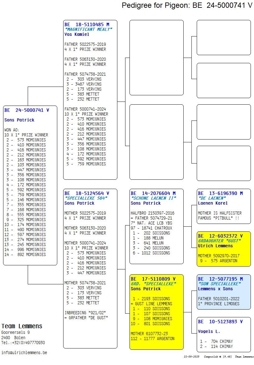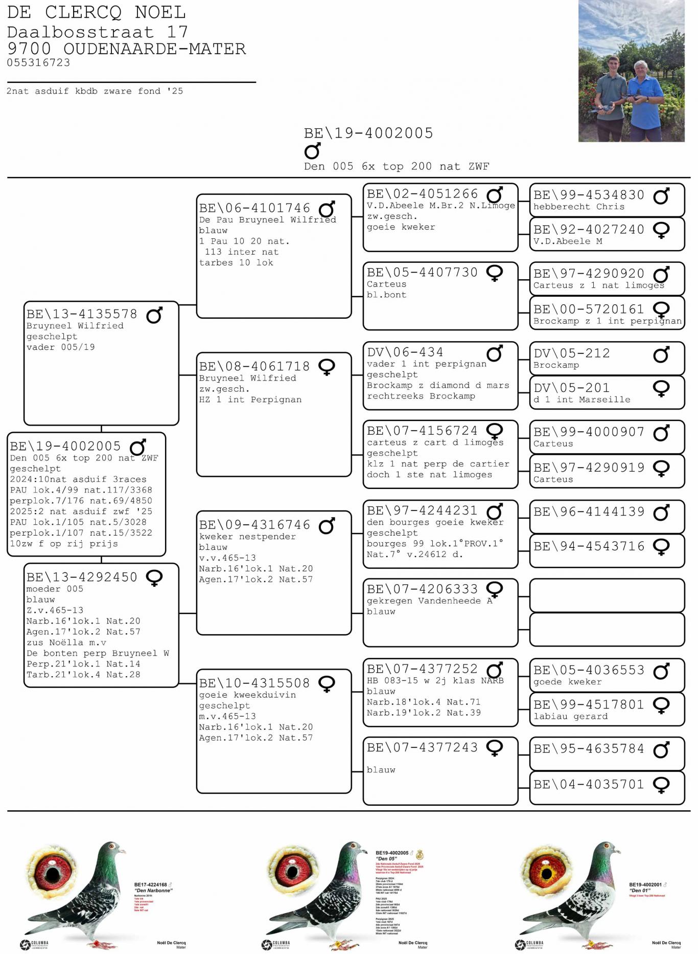 This top pigeon is no less than 6 years old and is now 2nd National Ace Pigeon marathon Distance Old Birds KBDB 2025. What a fantastic winner for this competition with 3 prizes. He also won a 69th Nat. Perpignan 4,850p - 117th Nat. Pau 3,368p and has won 10 prizes in marathon in his career