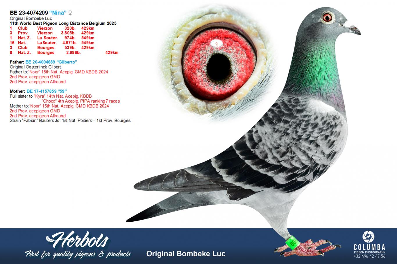 Under purchase 3 part 1, we also find a standout under the name "Nina." She is the full sister of "Noor," who in turn became the 15th National ace pigeon at Dries' loft. With a 16th national from La Souterraine (549 km) and a 3rd provincial from Vierzon against 3,805 pigeons (429 km), she also demonstrates that she possesses the necessary qualities.