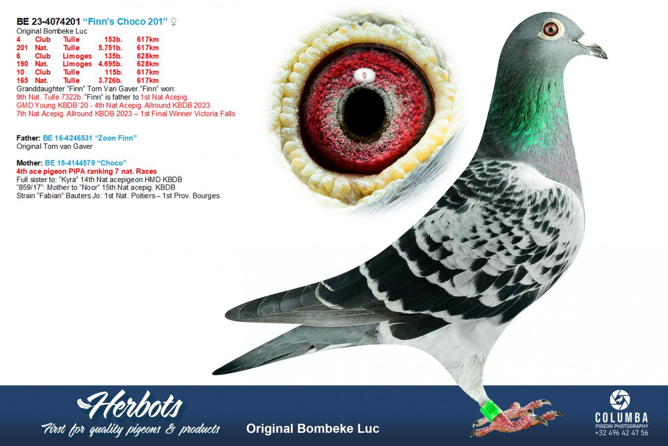 With 10 prizes 1/100, 3 first prizes, and the genes of the super breeder "Ricky" in her blood, she is one of the showpieces in this auction. She is also a half-sister of "Miss Bombeke" at Tom van Gaver.