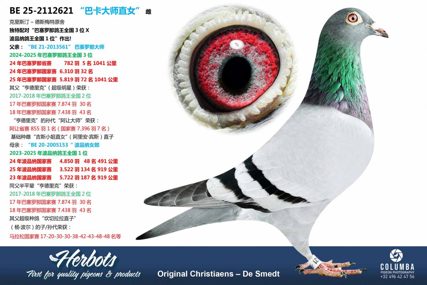 Daughter of "861/13" Grandson 2nd Nat. Barcelona Claire x "947/13" 3rd Nat. Ace Pigeon Barcelona 2016-2019 with, among others, 90th, 170th, and 178th Nat. Barcelona and 25th Nat. Marseille