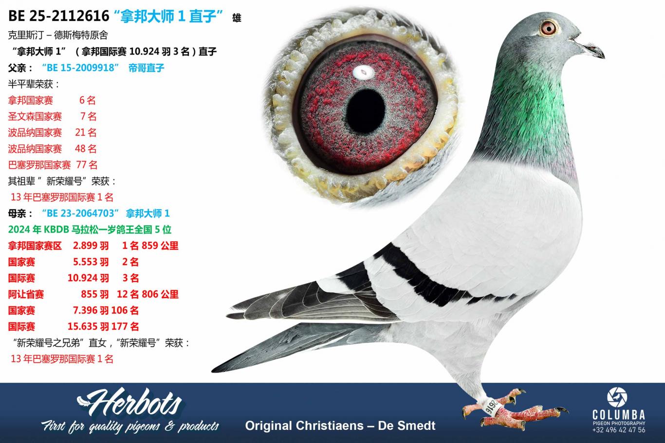 A daughter of “Barcelona Master” 3rd National Ace Pigeon Barcelona 2024-2025 x “Perpignan Lady” 1st Nat Ace Pigeon Perpignan 2023-2025. A very special and unique pairing