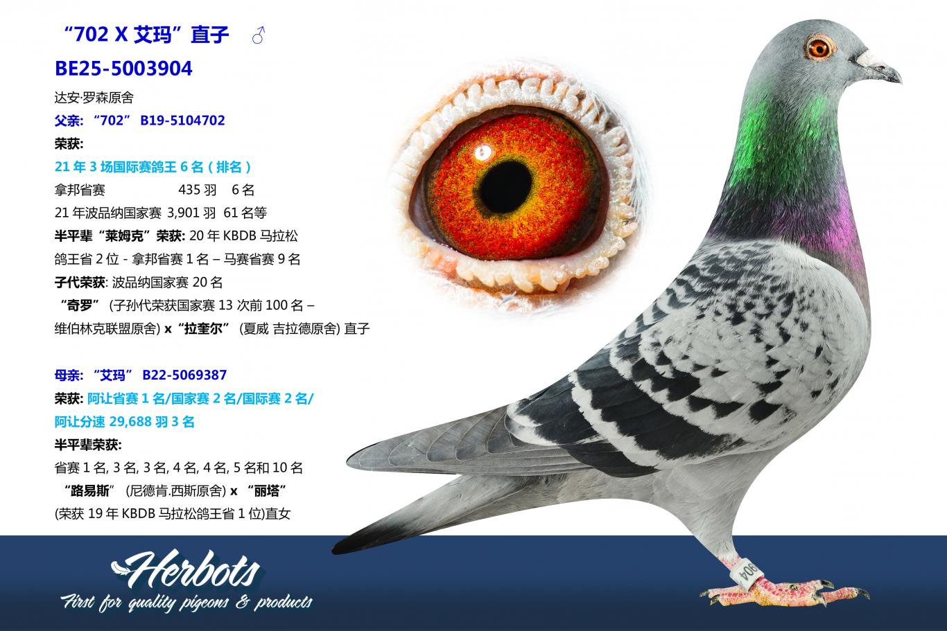 Daan enthusiastically continues the conversation: “One of my best pigeons is Rita, herself winner of 1st Provincial Ace Pigeon Extreme Long Distance 2019 and 2nd National Marseille. She already has several youngsters that fly early, including Emma (mother of lot 3), 2nd International Agen 2023.