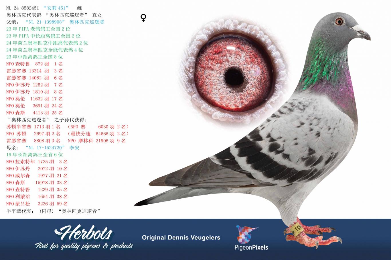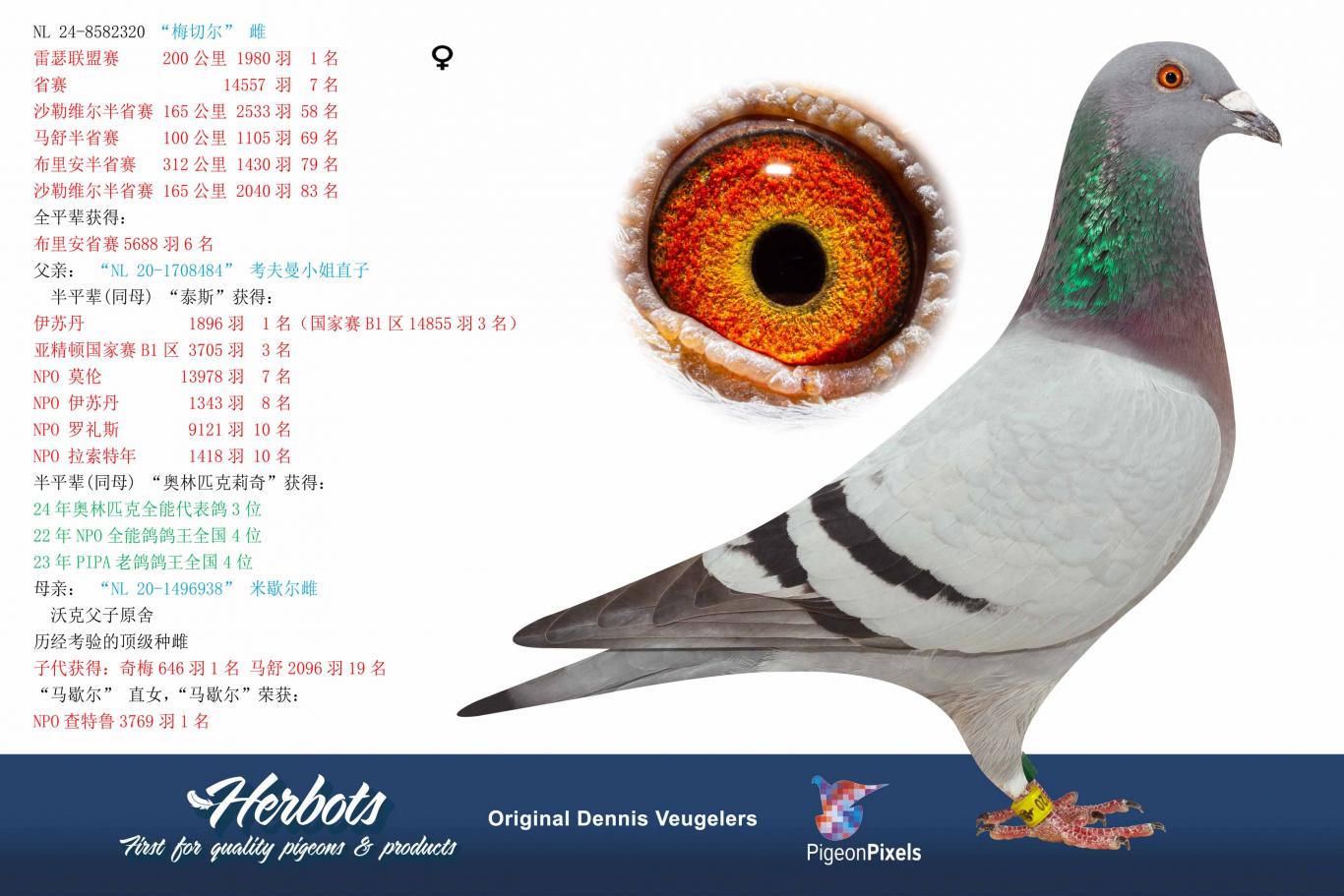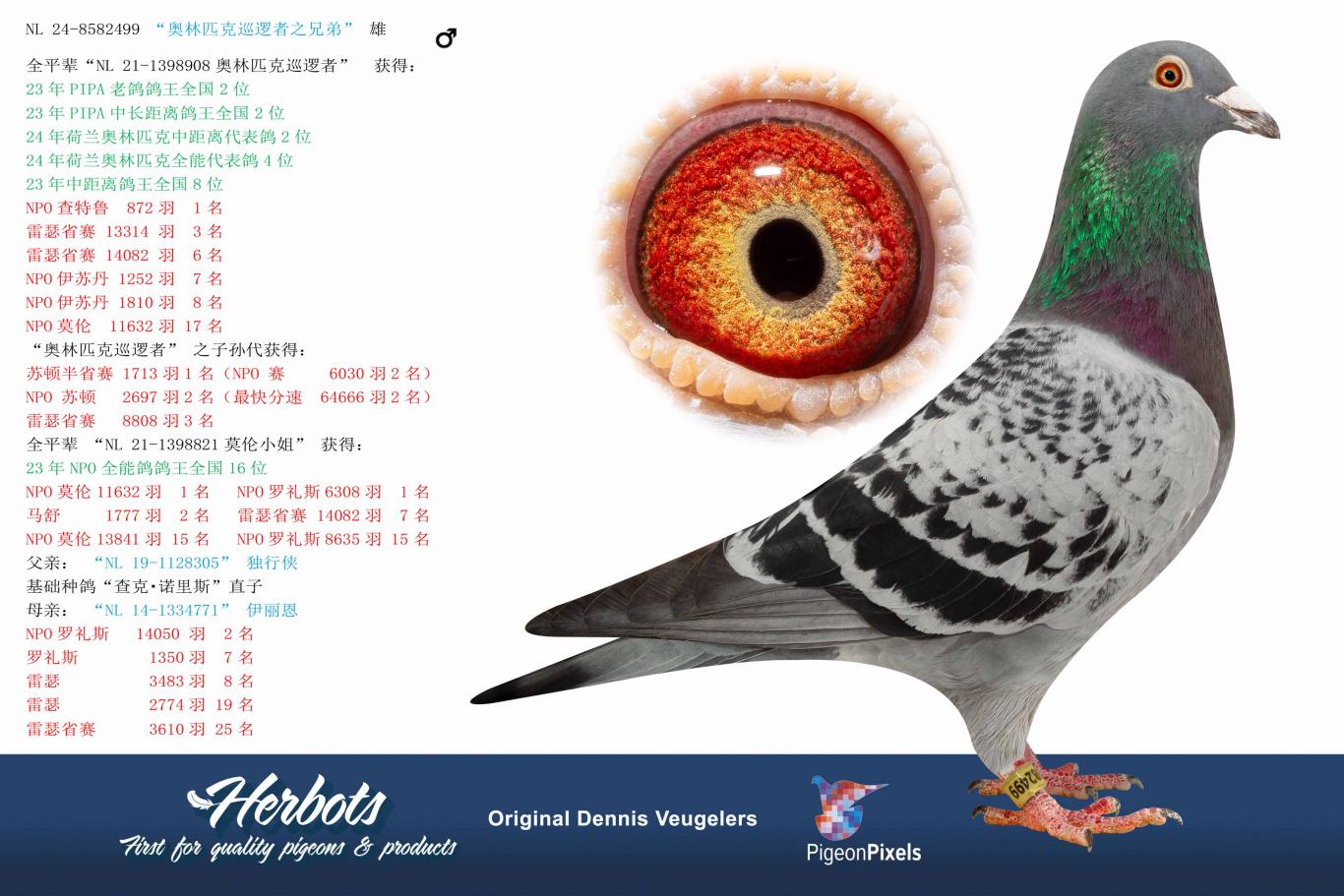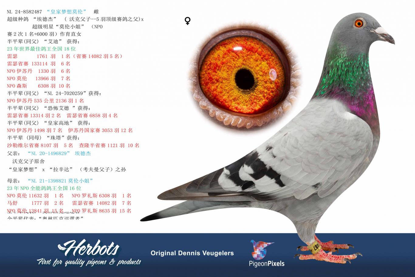 She herself has amassed an impressive palmares, winning two 1st NPO prizes against 6,300 and 11,600 pigeons. A wonder hen in the air, and now also in the breeding loft. She also immediately became the mother and grandmother of several top pigeons