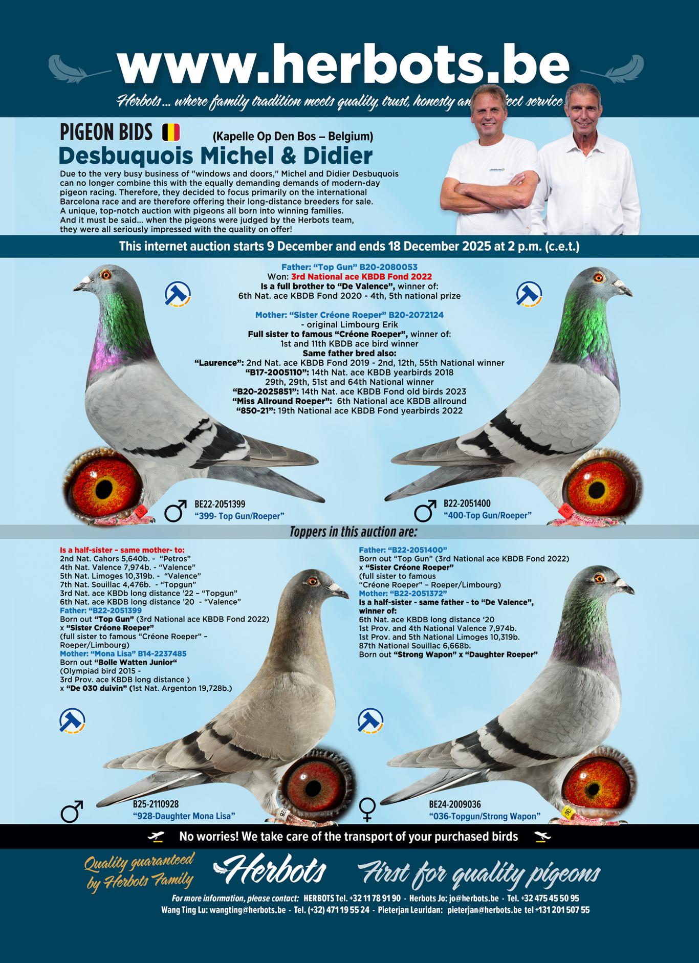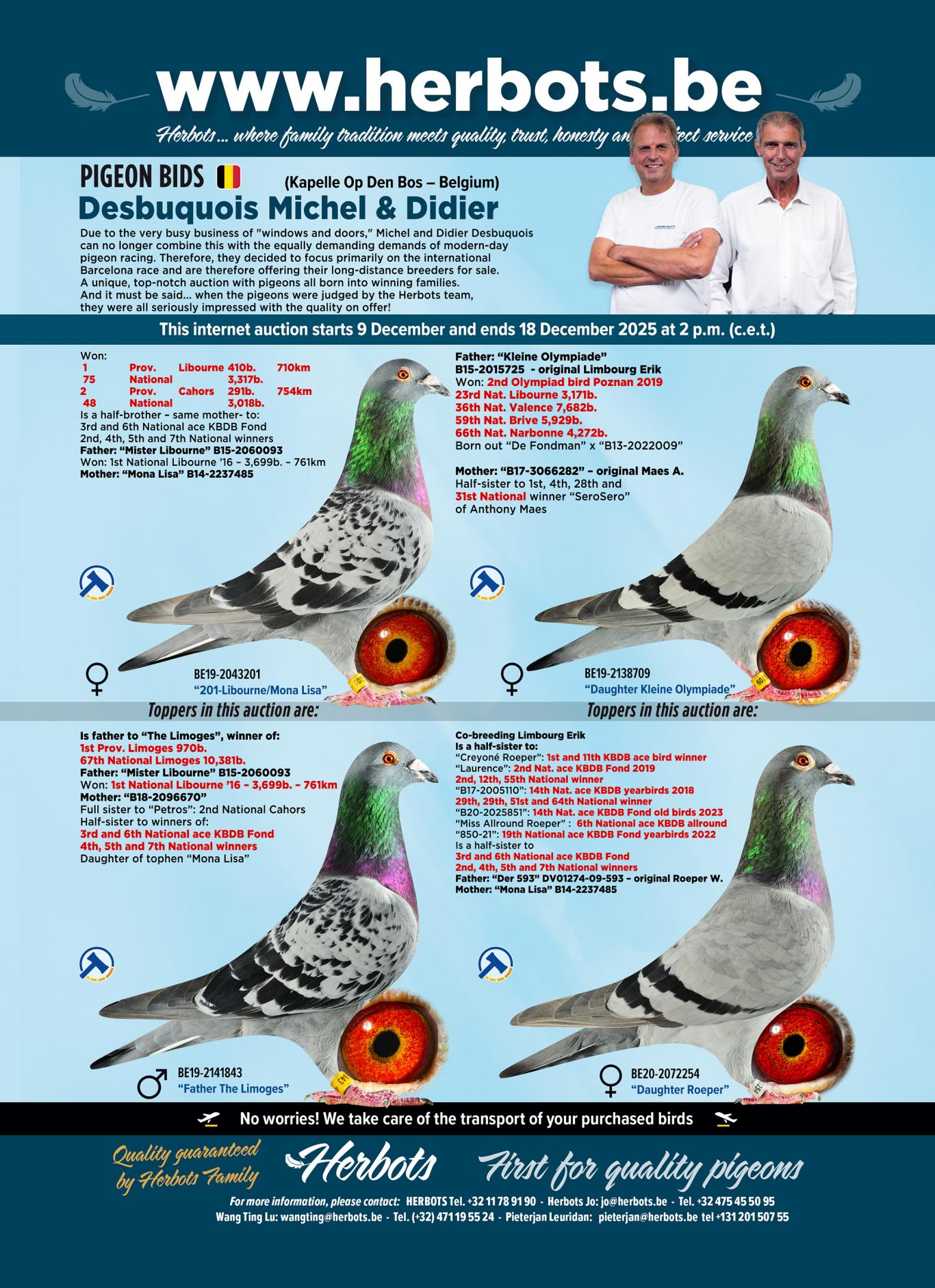 And – as the Herbots team – we can confirm that there's a tremendous amount of quality on offer. When our team judged the pigeons they all agreed: “These are pure class pigeons and you get goosebumps when you handle these pigeons.”