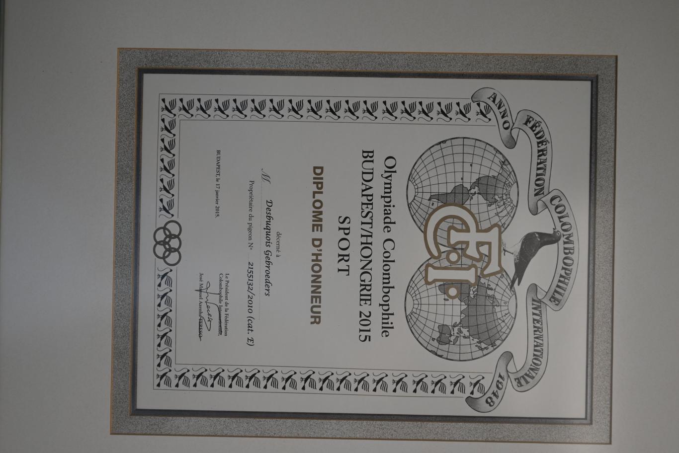 Crosses with Limbourg pigeons include "Pedro" (6th Nat. Perpignan 2005, 28th Nat. Perpignan 2006, 40th Semi-Nat. Chateauroux 11,526 p.) and a half-brother of "Romulus" (Primus Inter Pares Brugse Barcelona Club 2007 to 2011). There is also “Black Power” (8th Nat. Perpignan 2011), “Skyfall” (11th Nat. Perpignan 2012 against 6,661 p.), “Dina” (5th Nat. Ace Pigeon Extreme Long Distance K.B.D.B.), “Lucas” (2nd Nat. Ace Pigeon Extreme Long Distance K.B.D.B. 2005). “De 300” (“Son Joost”, Joost De Smeytere x “Chenoa” (1st Olympiad Pigeon, Bras -NL), both purchased by Erik Limbourg, were also pigeons that embody the best of the colony. More recently – also through Erik – there has been the introduction of Wolfgang Roeper pigeons, and mainly the offspring of “Der 593”.