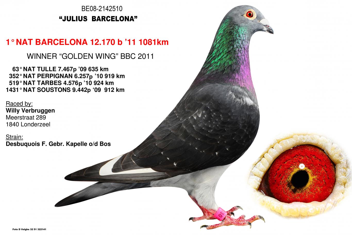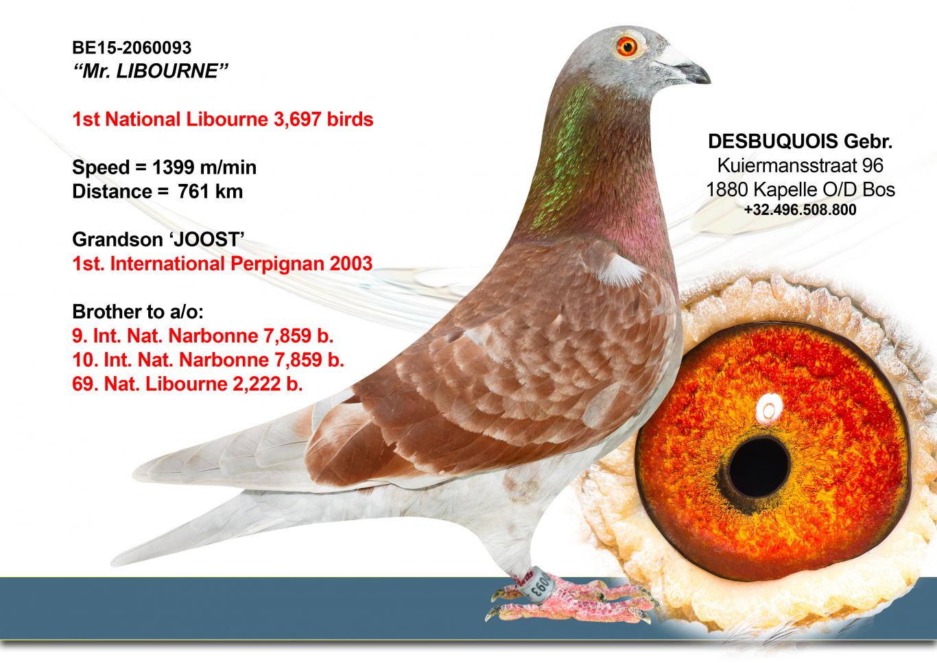The national winner of Libourne against 3,699 yearlings. "Mister Libourne" is a dream in the hand... a very strong pigeon... medium to large in size... in short, a bundle of power. "Mister Libourne" was born into a family of winners. His brothers have already won 7th National Narbonne 7,859 p. – 10th National Narbonne 7,859p. – 5th Ace Pigeon Provincial KBDB Long Distance, etc. On his father's side, "Mister Libourne" is a grandson of the well-known "Joost" (B02-4051564 – 1st International Perpignan for De Smeyter-Restiaan and a top breeder for Eric Limbourg) and a grandson of "Chenoa" (NL03-1144853 – won 8th Nat. Montauban 7,440 p. – 12th Nat. Bergerac 12,956 p. – 17th Nat. Bordeaux 9,277 p. and 44th Nat. Bergerac 14,576 p.). On his mother's side, "Mister Libourne" is a grandson of the top pigeon "Pedro" (B04-2010583 – won 6th Perpignan 3,796 p. – 14th Perpignan) 4,666 p. and 28th Perpignan 6,765 p.) and a grandson “Beauty 85” (a daughter of national KBDB ace pigeon “Lucky 85” – Limbourg Eric)