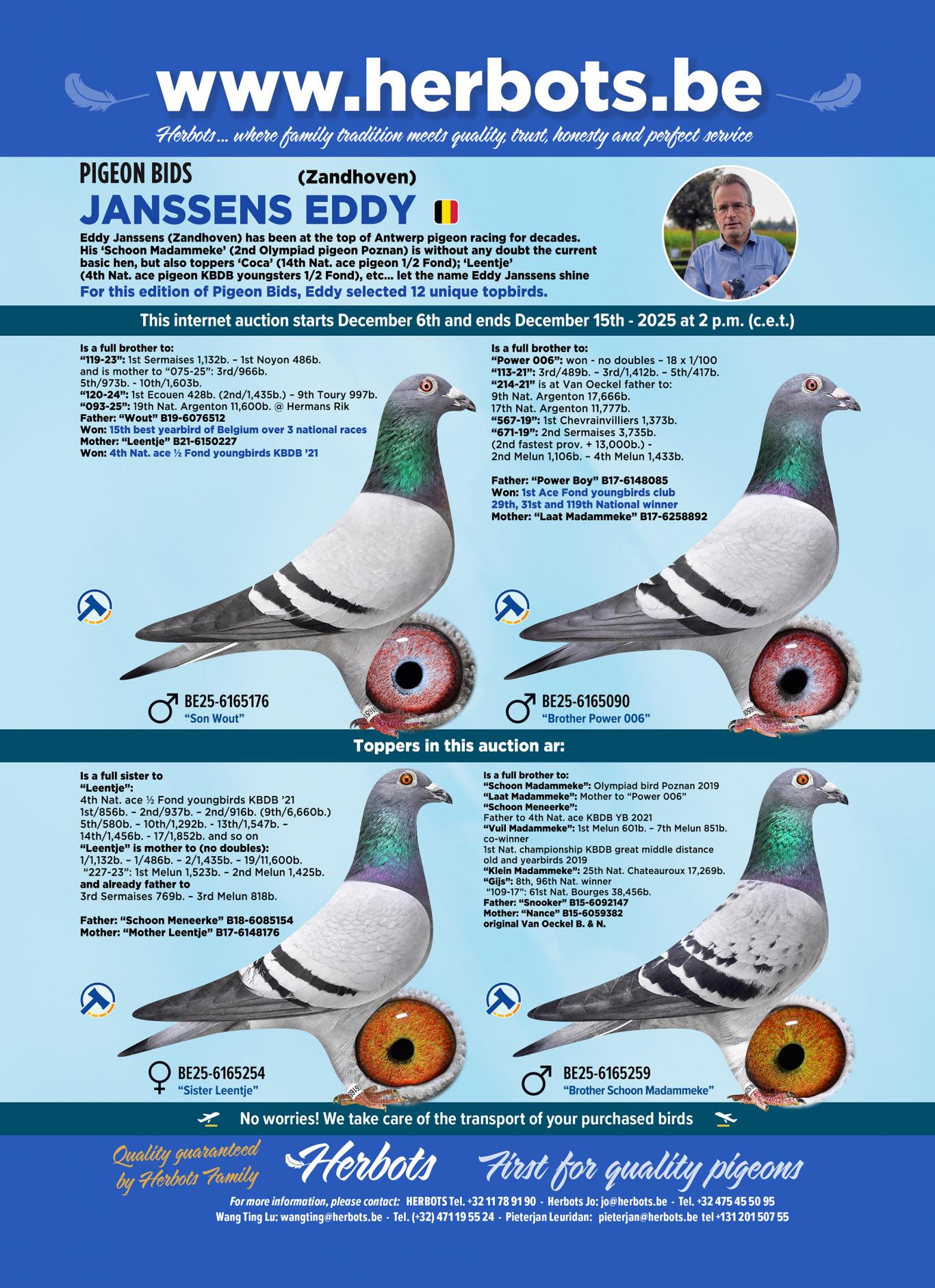 Eddy Janssens is one of the highly respected top pigeons from the province of Antwerp. In 2018, Eddy became 2nd Nat. Champion extreme middle distance yearlings and 2nd Nat. Champion short middle distance youngsters KBDB. The icing on the cake was the Olympic selection of "Schoon Madammeke" as Olympiad pigeon old birds Poznan 2019. The 2019 season saw him win 1st Nat. Zone Bourges 7,052 old birds (2nd Nat. 24,055 p.) and 1st Nat. Champion extreme middle distance old and yearlings KBDB 2019. In the following years, Eddy focused primarily on the shorter middle distance, naturally achieving stunning results, including 1st Ace Pigeon Union Antwerp yearlings 2023 and 1st General Champion middle distance Union Antwerp 2024.