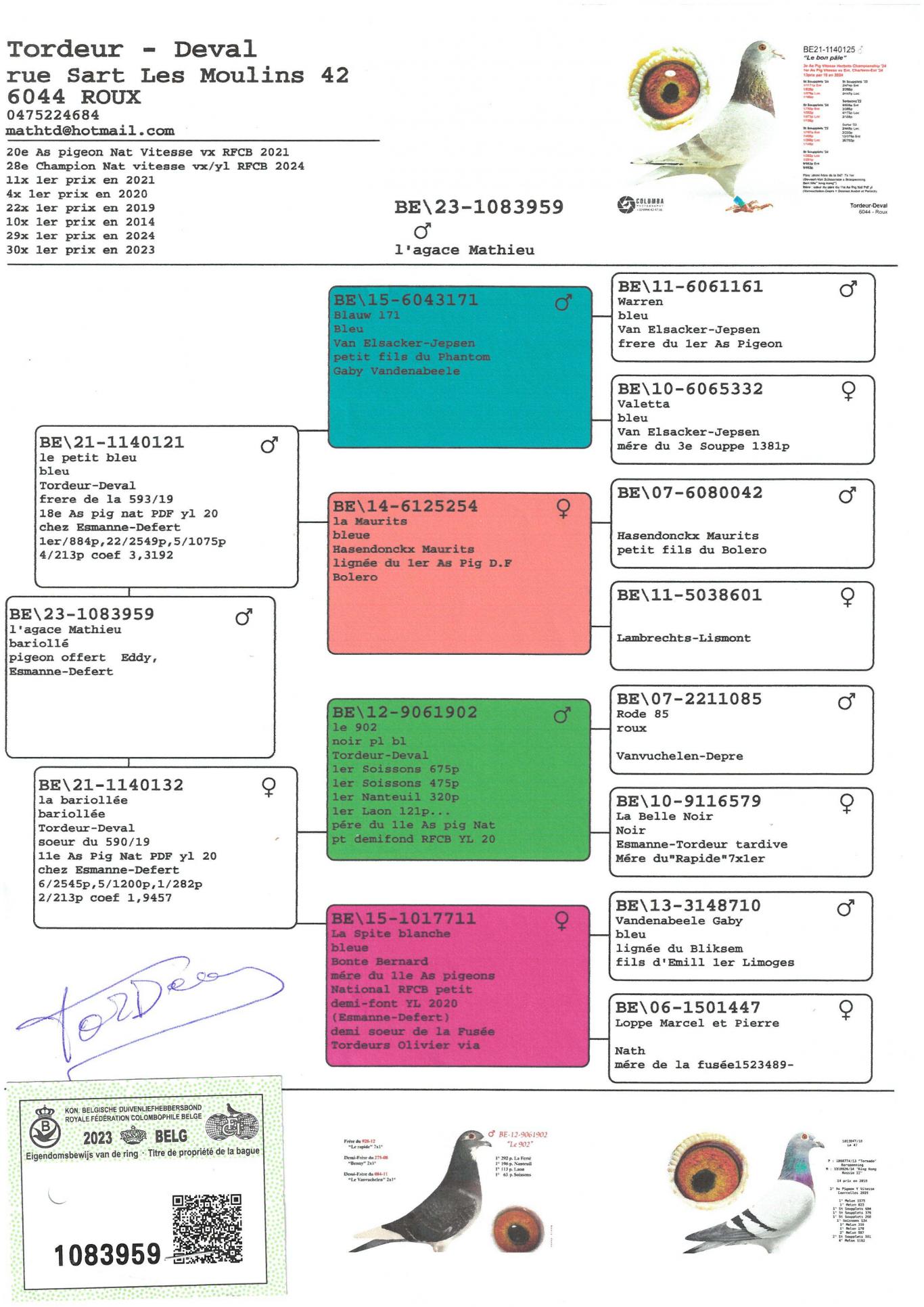 This pigeon is also a candidate for the next Olympiad (category G). He comes directly from the Kévin Saudoyez colony (Péruwelz), and his pedigree includes the famous Saudoyez foundation pair (BE13-9039452 x Gold Ingrid) on both his father's and mother's sides.