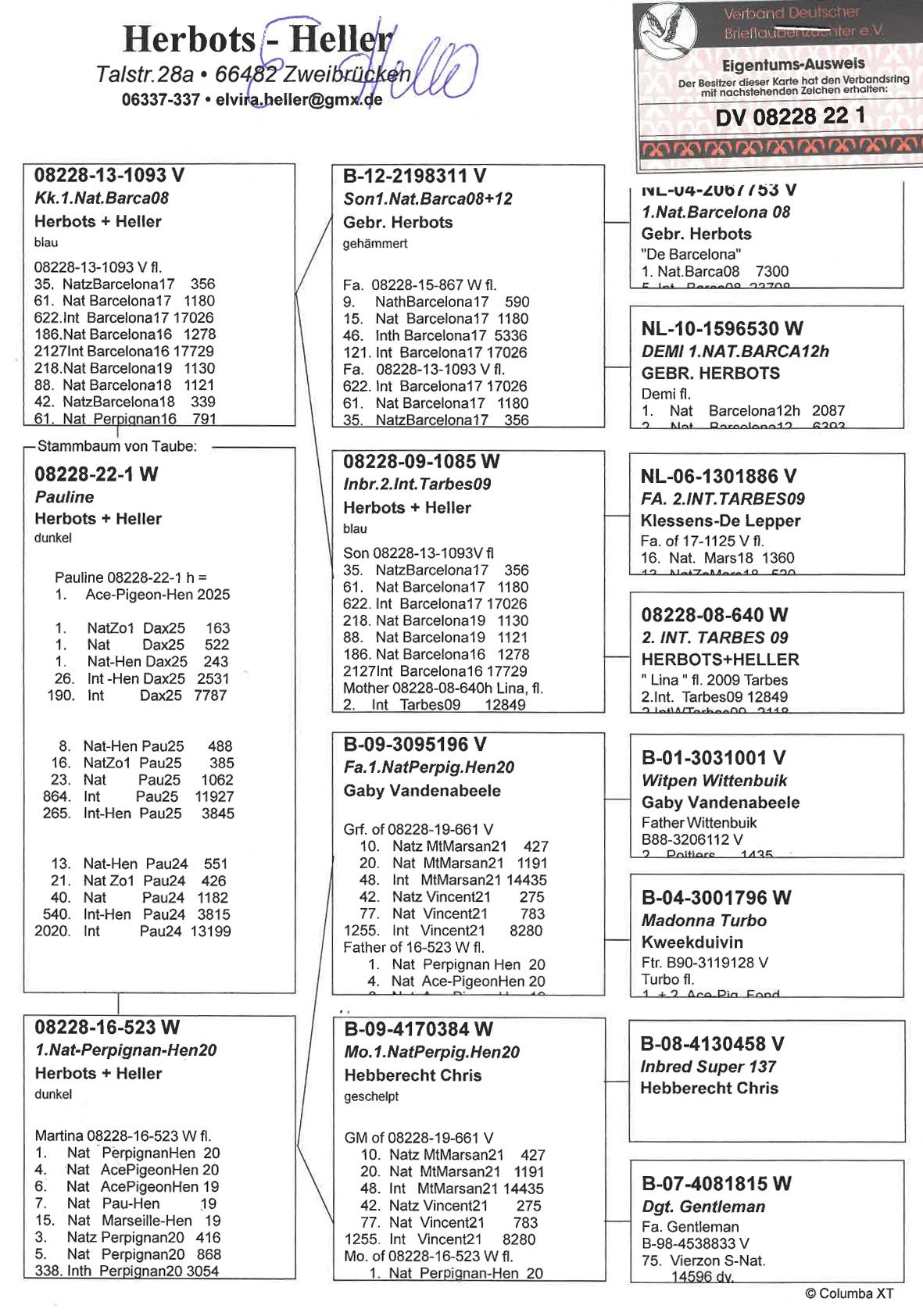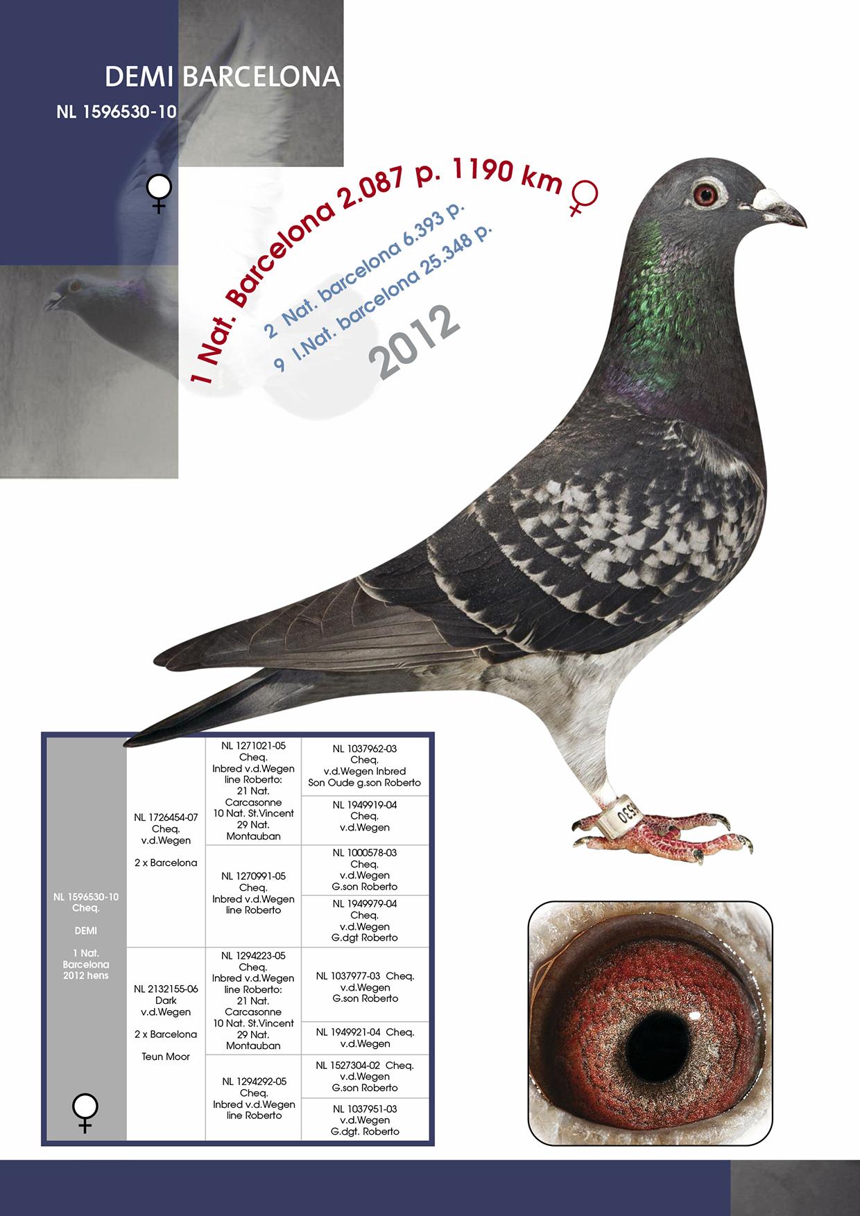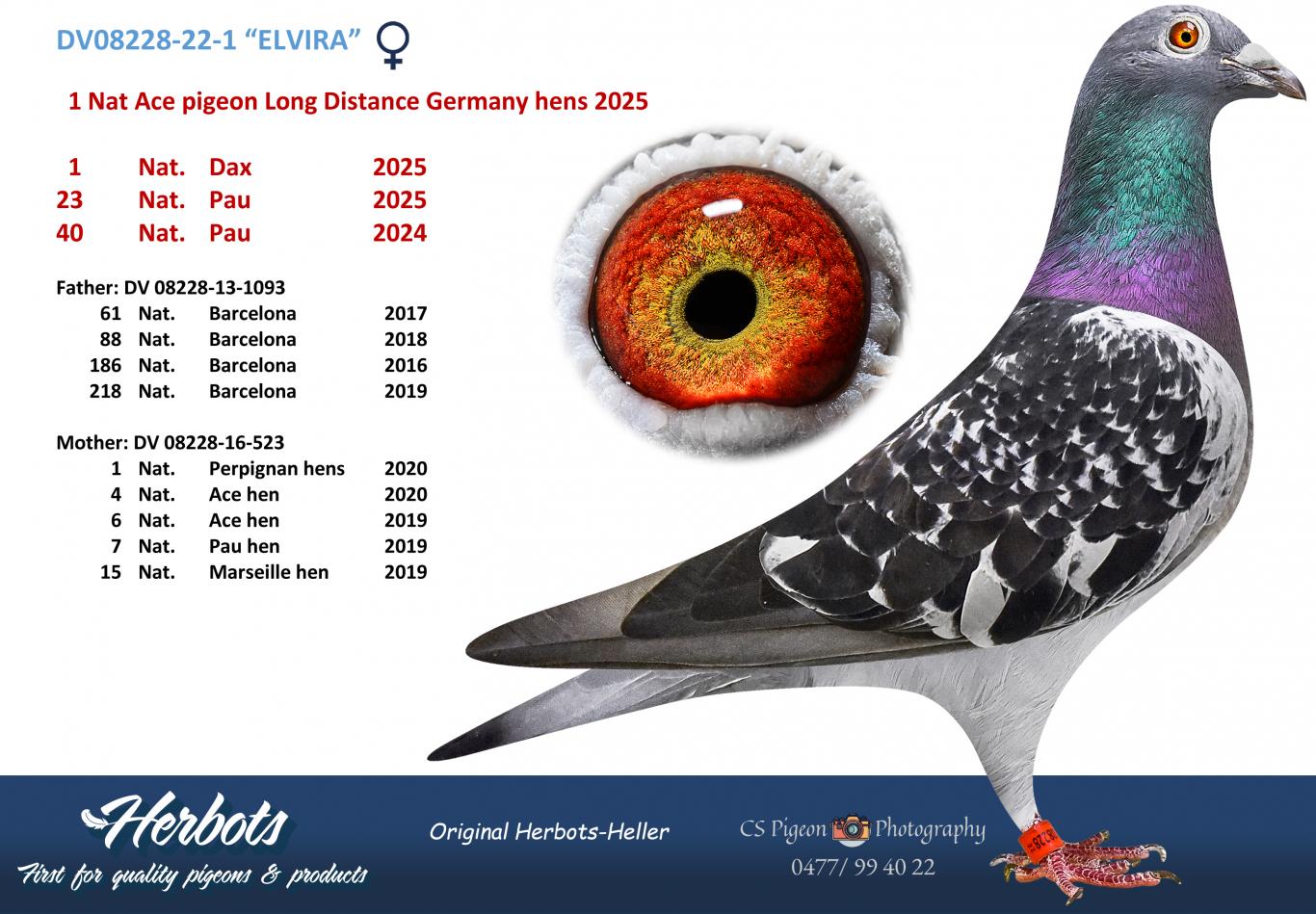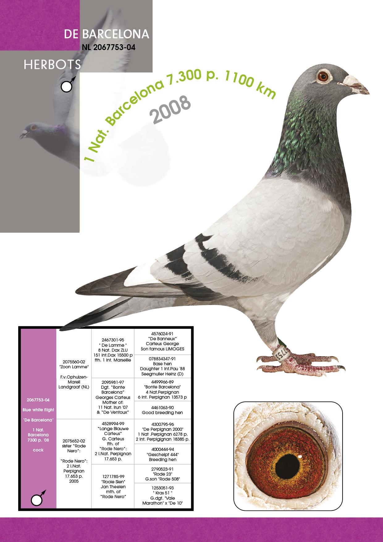 - Father: 08228-13-1093 V, son of B 311 V (original Herbots), himself out of the 1st National Barcelona 2008 against 7,300 pigeons.