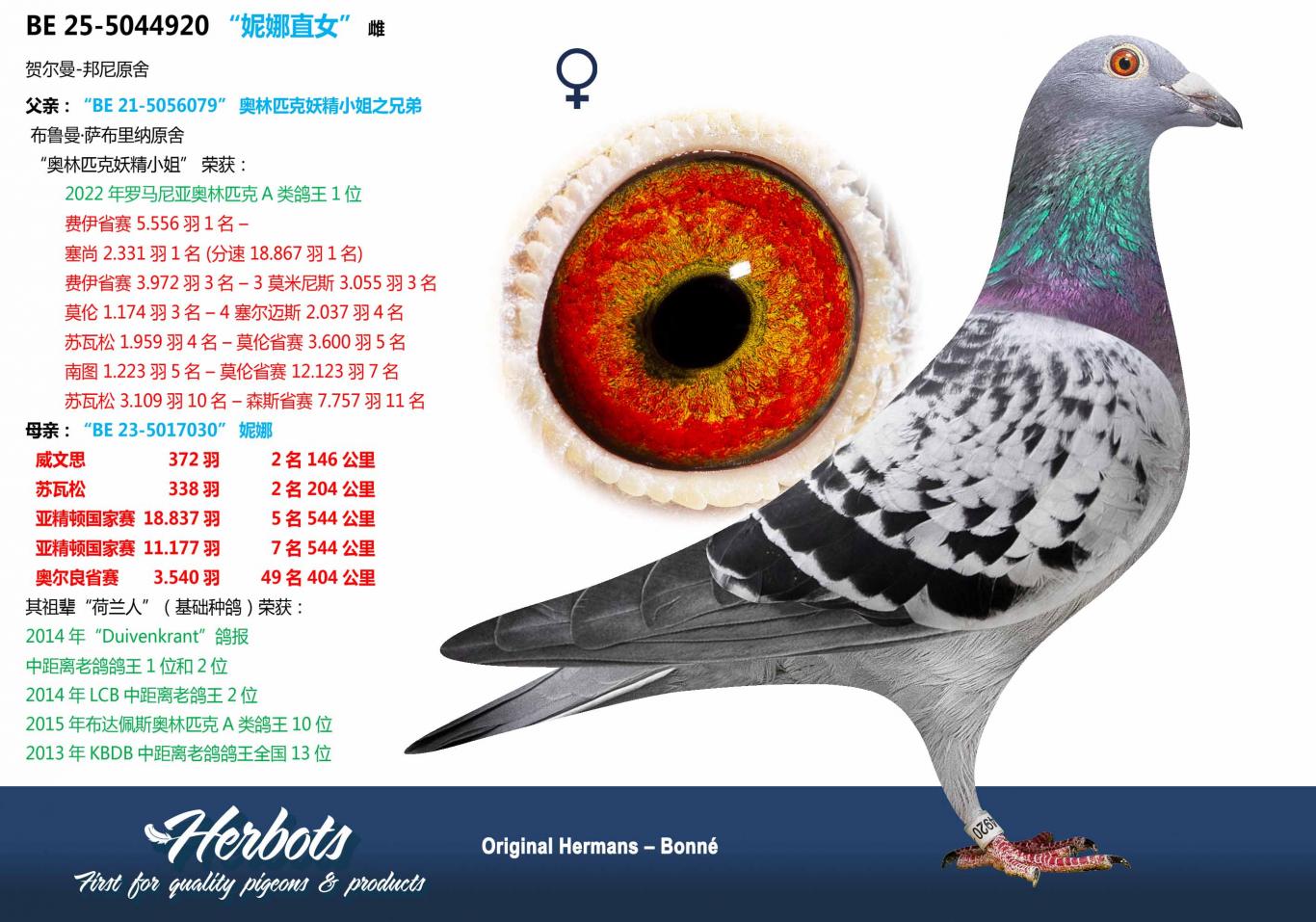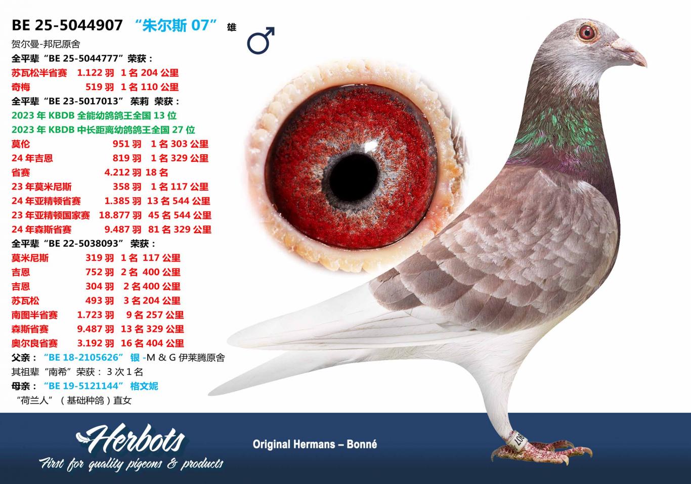 This pairing has produced several top pigeons and is considered one of the best pairs at the Hermans-Bonne family. The brother "093/22" won 1-2-2-3-4-9-… and the new young star "777/25" won two first prizes in the sprint in 2025 as a young bird and is one of the favorites for the coming season.