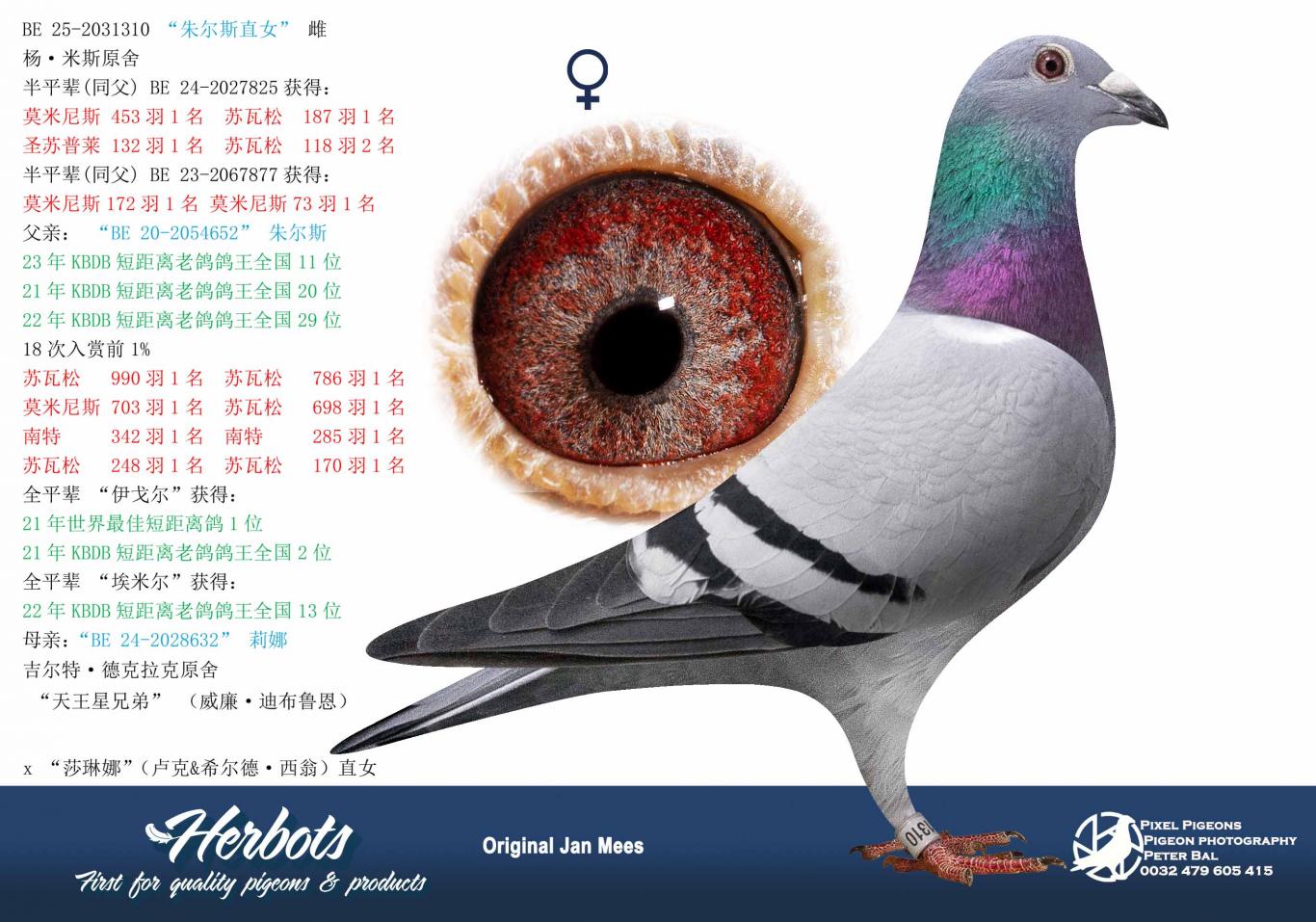 Furthermore, thanks to the pigeons sold abroad, several references have quickly emerged, further demonstrating the quality of the Jan Mees pigeons. Several pigeons have quickly caught the eye of Alfie Hawnthorn from Newcastle (UK). The pigeon "Super Jan" NEHU 24X2253 is proof of this. See photo below.