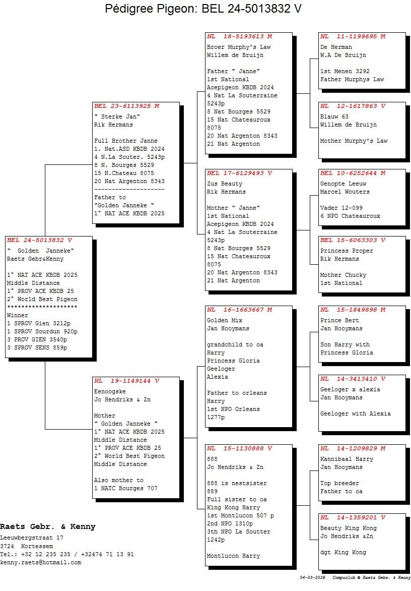 Son of "294/15" Stefaan – Stefaan Lambrechts x "260/18" Line Kittel x Olympiade 003 Leo Heremans via Rudy Van Reeth.