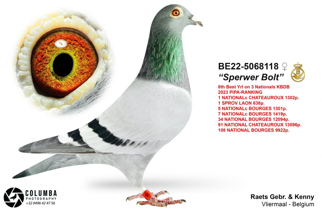 Daughter of "012/19" De Vlieger, winner of 2 x 1st Rudy Van Reeth x "331/15" Late Leo is the line of Bolt and Gilbert Leo Heremans and dam of 2nd Nat. Argenton 13,393 p.