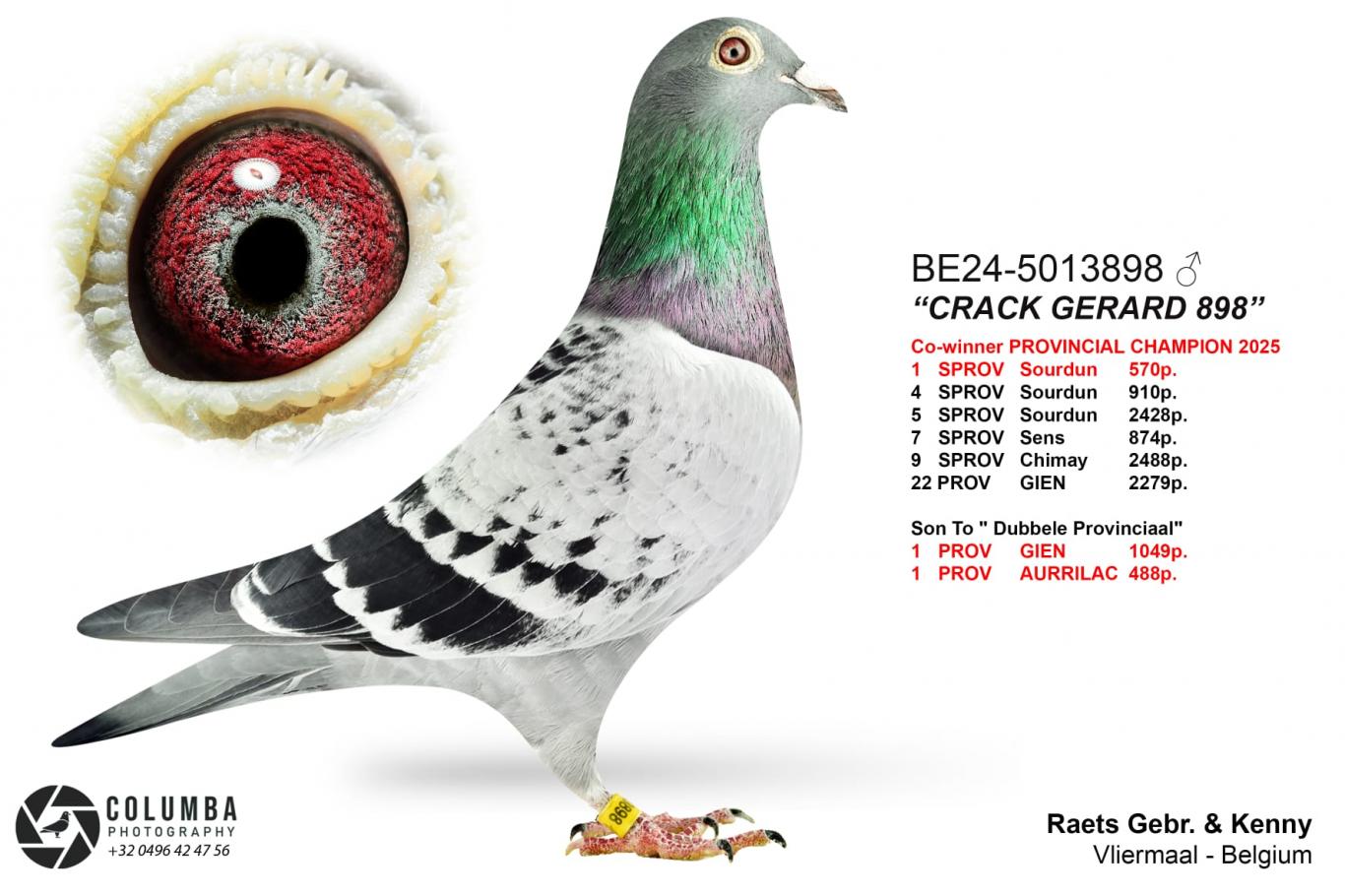 Won 3rd Prov Ace Pigeon Middle Distance KBDB – 2 S.Prov. Sourdun 1,472p – 2 S.Prov. Sourdun 739p, 2 S.Prov. Dizy 1,341p – 2 S.Prov. Gien 434p – 8 S.Prov. Chevrain 968 p.