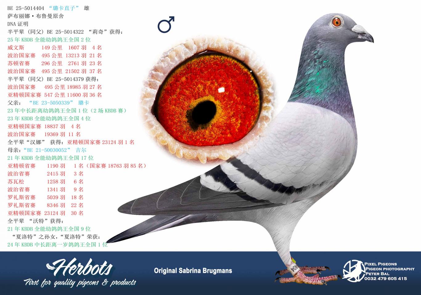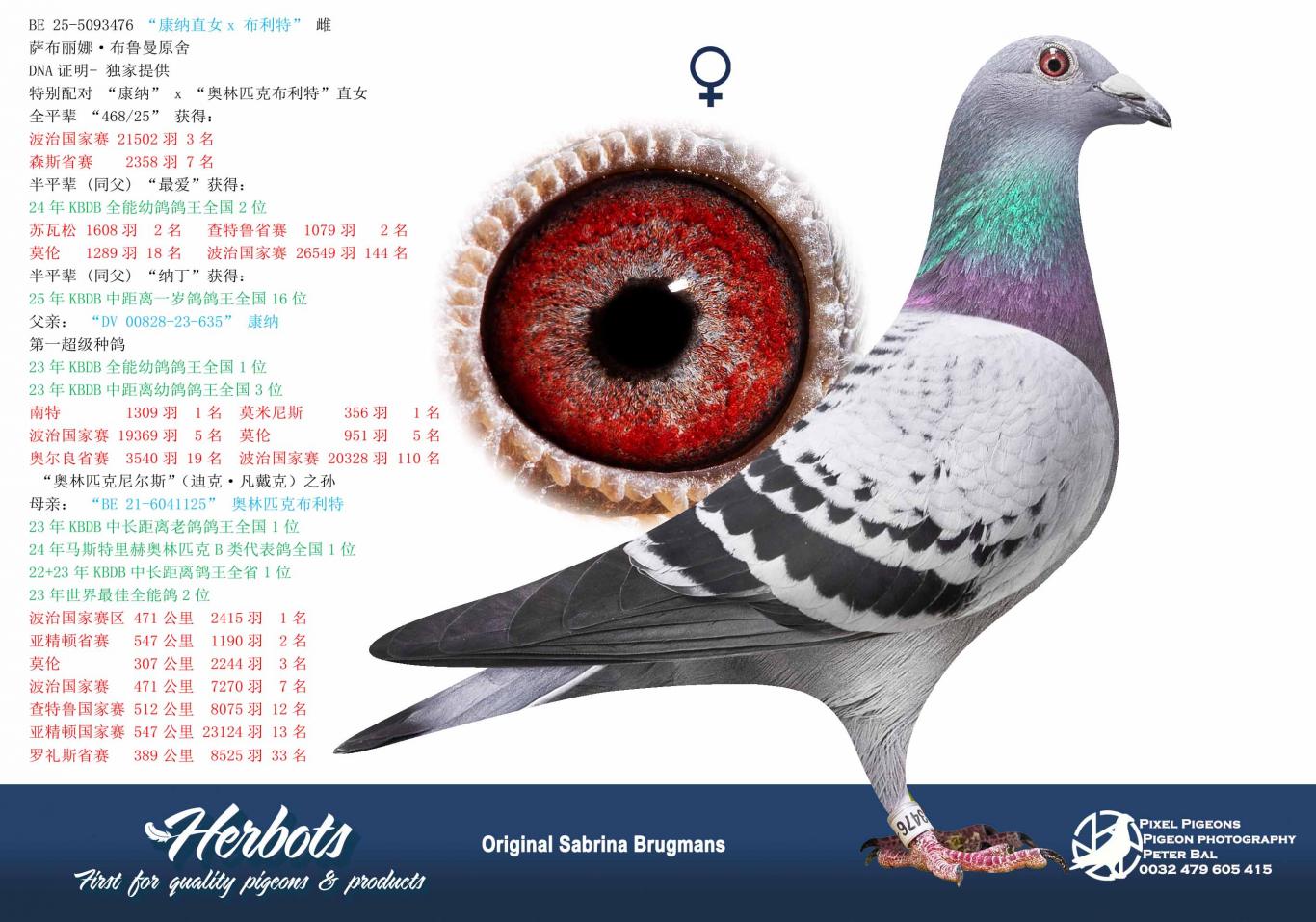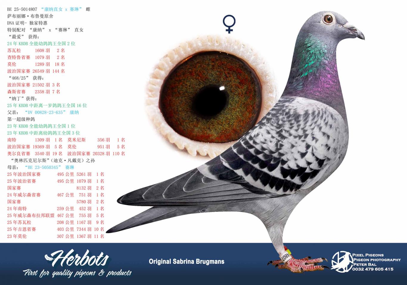 Daughter of "919/18," a nest brother of Natacha, who became 5th Nat. Ace Pigeon Middle Distance KBDB 2018, x "824/18," a sister of Lien, 3rd Nat. Ace Pigeon Middle Distance KBDB 2020.