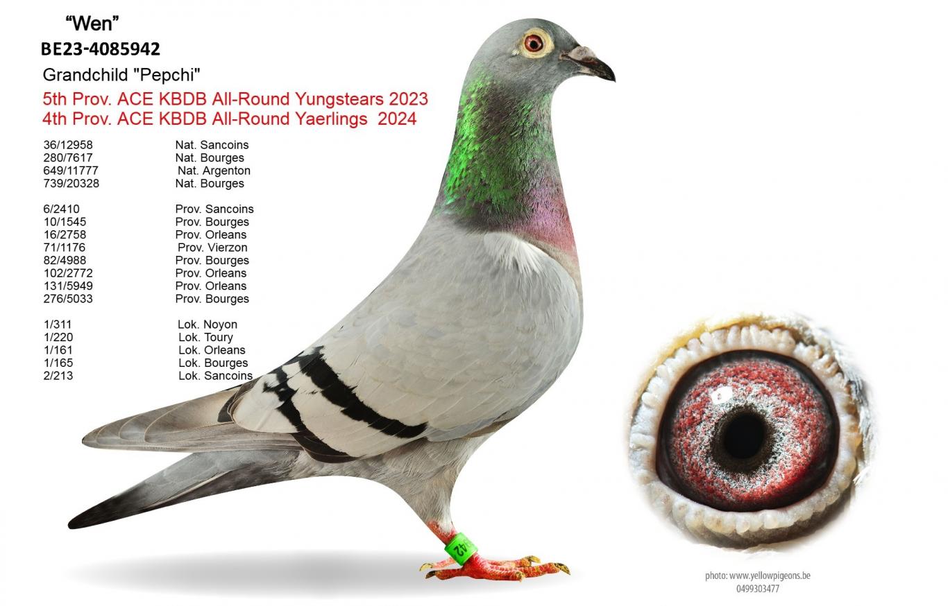 What's striking is that the power of the Steveninck pigeons doesn't stop after one generation. No…the examples of champions being bred after two, three, and even more generations are unprecedented. Few colonies in Belgium can boast such references. The common thread throughout the colony remains "Chipo" and his countless offspring, and the beauty of this story is that this line is perfectly suited for crossbreeding. The "winning genes" of the Chipo line embrace enrichment. An example is "Pepchi" x "Inteelt 178" (a direct Engels Jules and Yves hen). They are grandparents of, among others: