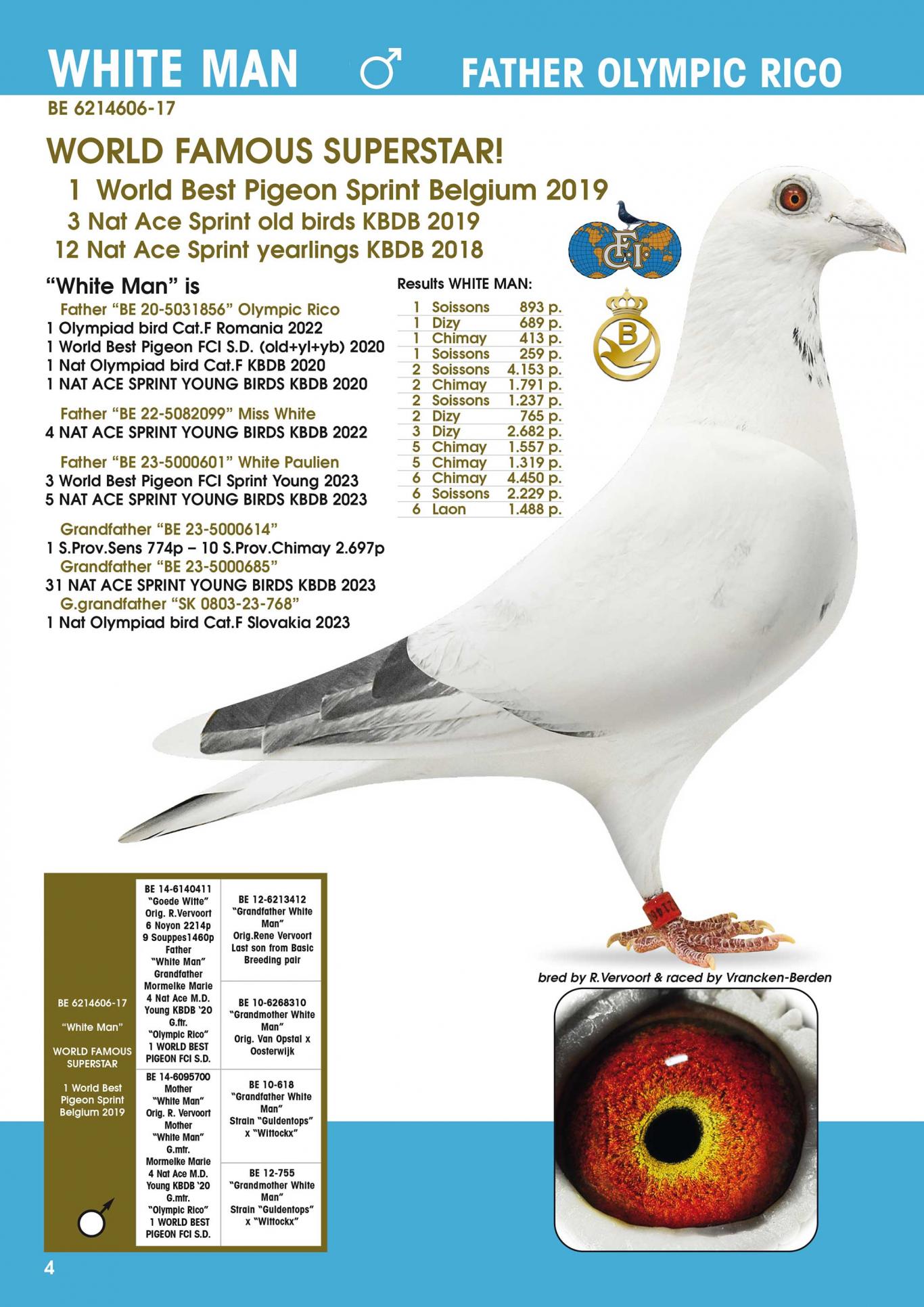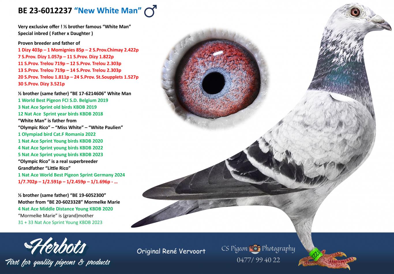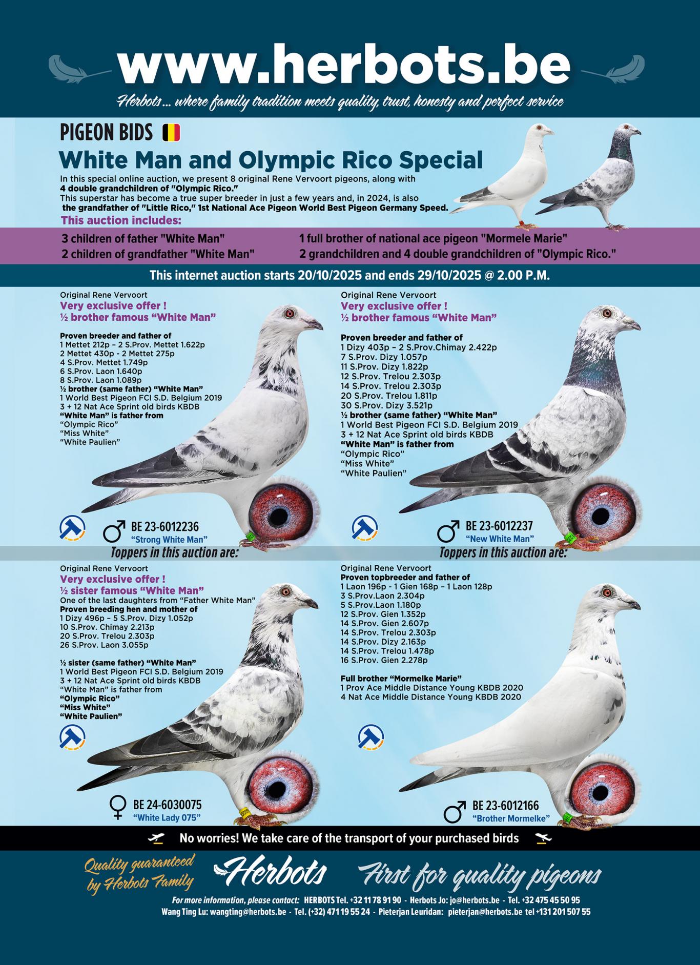 These pigeons are also performing exceptionally well at Kenny Raets's loft in Kortessem, Limburg, and these proven breeders are now being offered in an exclusive auction. Half-brothers and sisters of superstar "White Man," a full brother of super hen "Mormelke Marie," and several pigeons inbred to the stock sire "White Man." The breeding results for each pigeon are listed, and here, too, several first-prize winners are, of course, included.