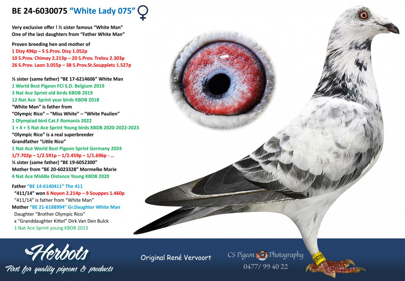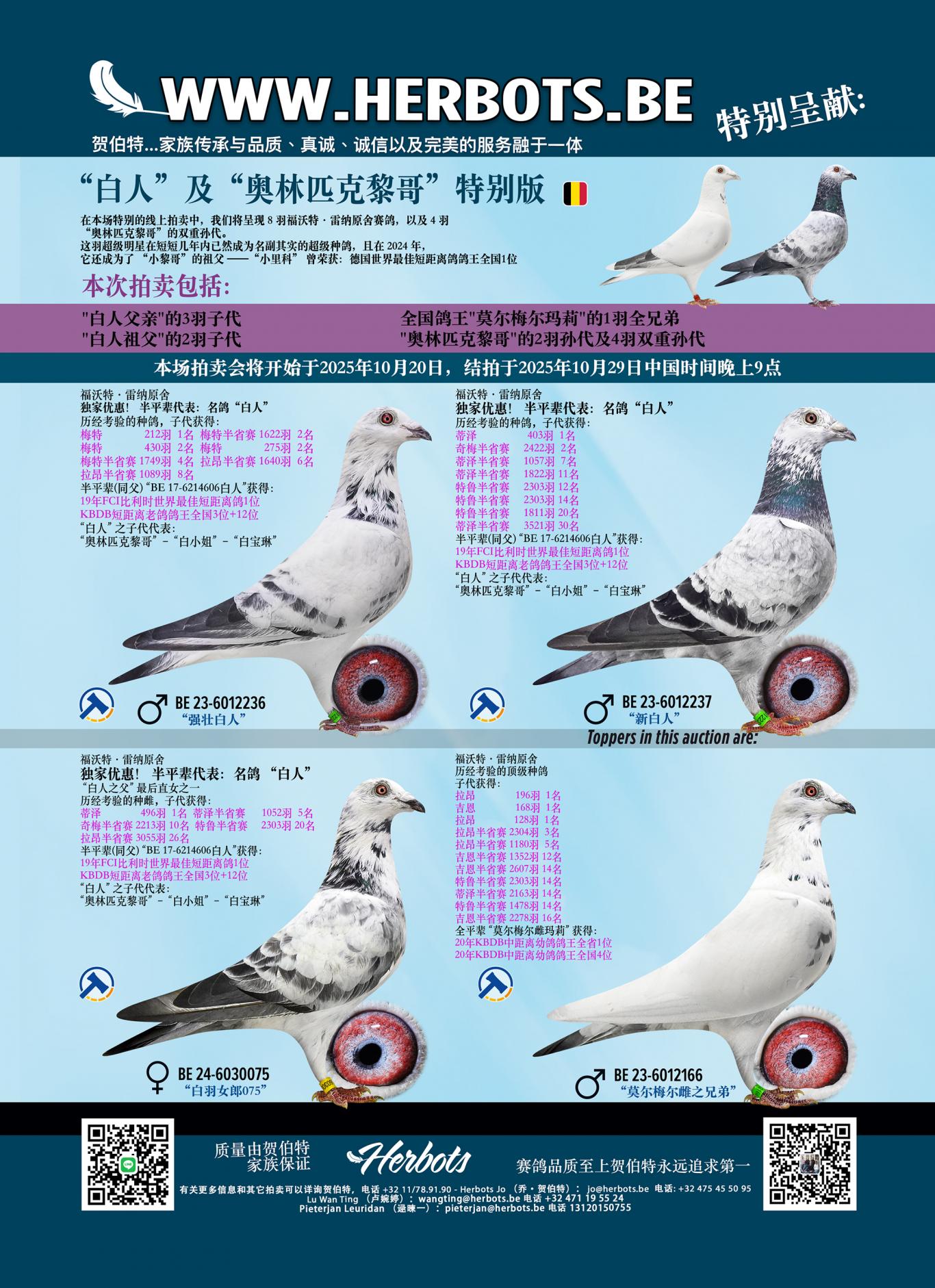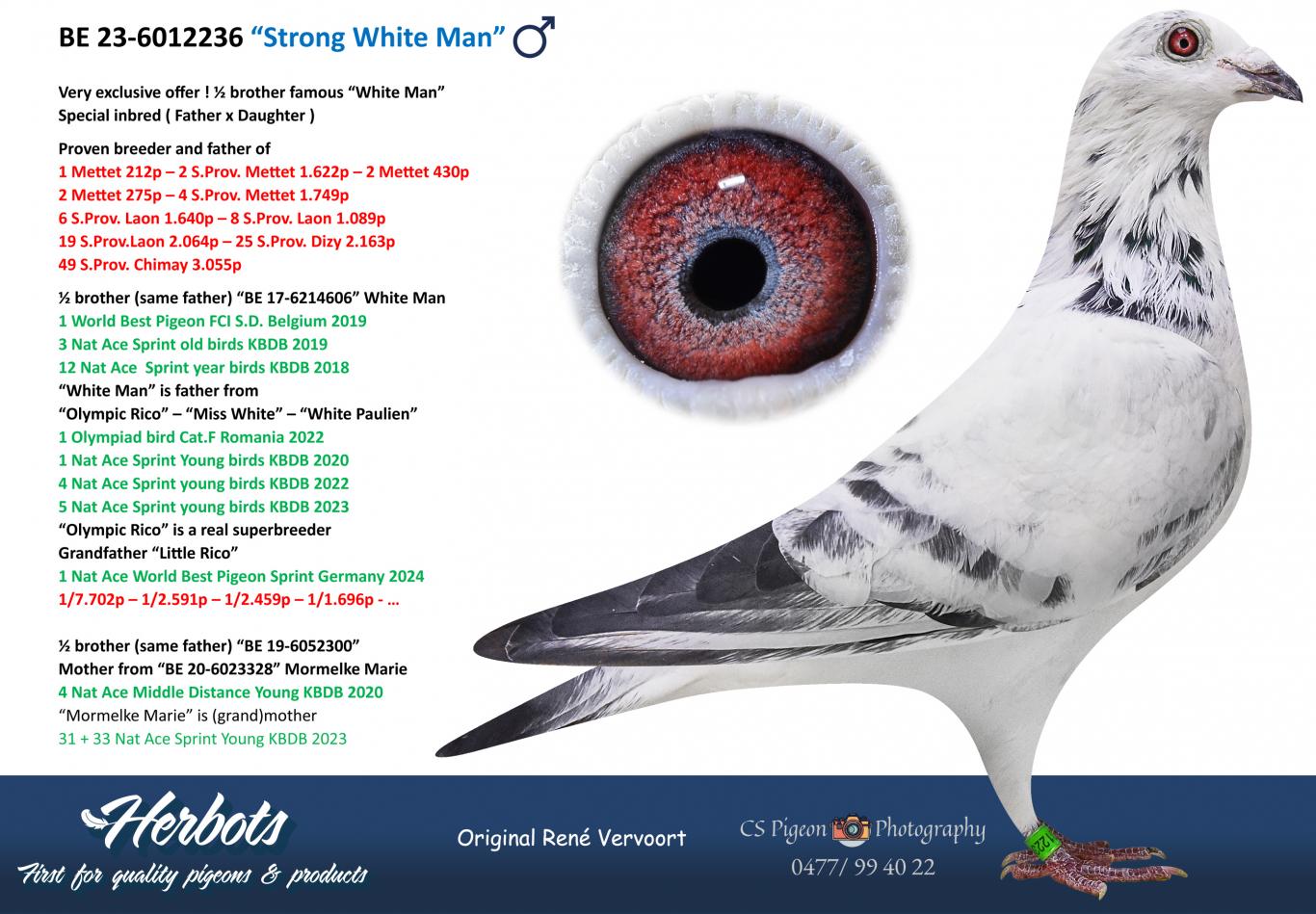 These pigeons are also performing exceptionally well at Kenny Raets's loft in Kortessem, Limburg, and these proven breeders are now being offered in an exclusive auction. Half-brothers and sisters of superstar "White Man," a full brother of super hen "Mormelke Marie," and several pigeons inbred to the stock sire "White Man." The breeding results for each pigeon are listed, and here, too, several first-prize winners are, of course, included.