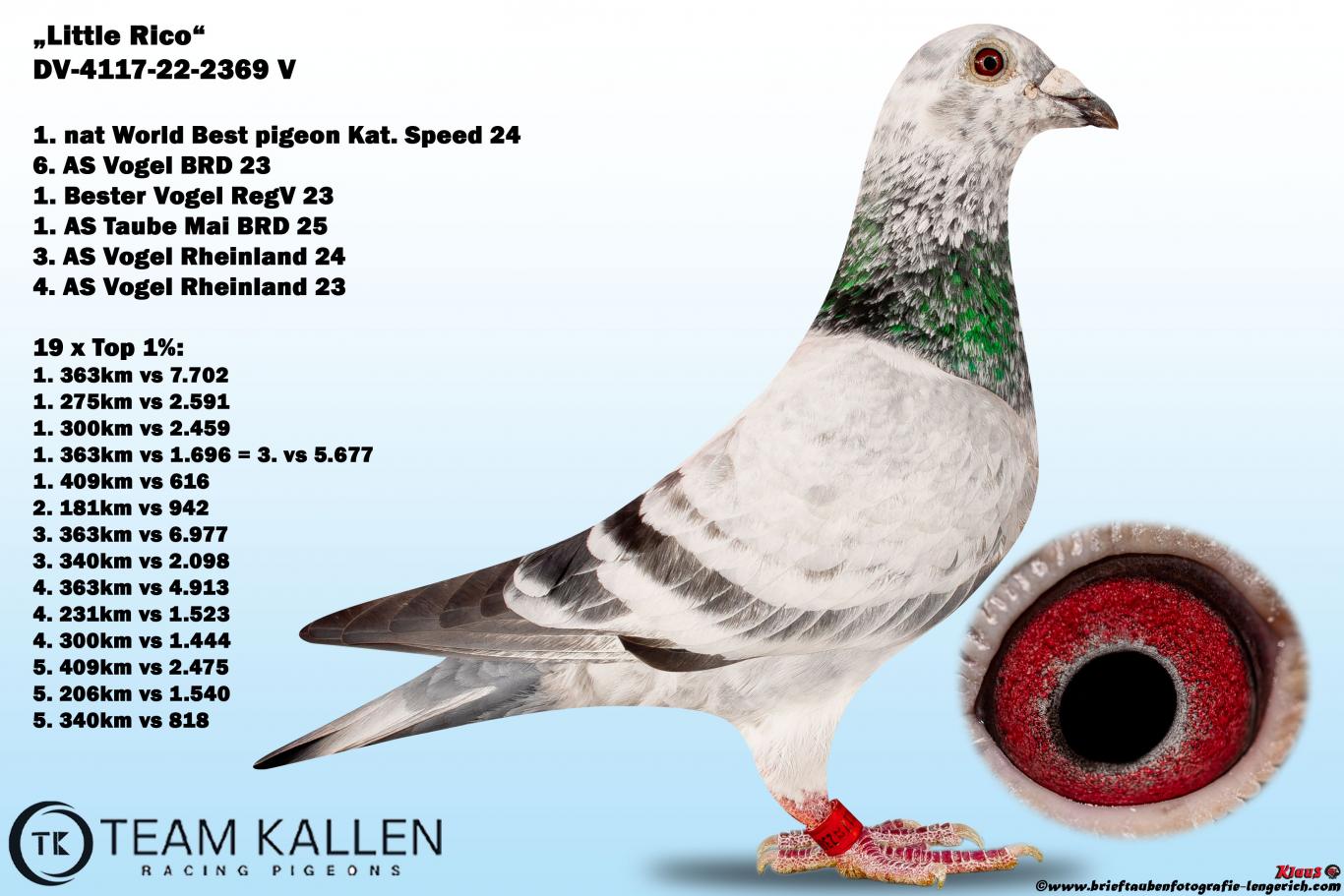 This superstar came to us as a young pigeon after his racing career ended in Kuringen. He won several ace pigeon titles and immediately made his mark as a super breeder. He is the sire and grandfather of several super pigeons, which you can certainly see in the photo. In 2024, he also became the grandfather of "Little Rico," who flew for Team Kallen in Germany. This super pigeon, like his grandfather, was 1st World Best Pigeon Sprint in Germany in 2024.
