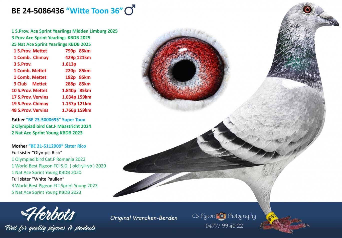 25 Nat Ace Pigeon sprint yearlings KBDB with “Witte Toon 36”