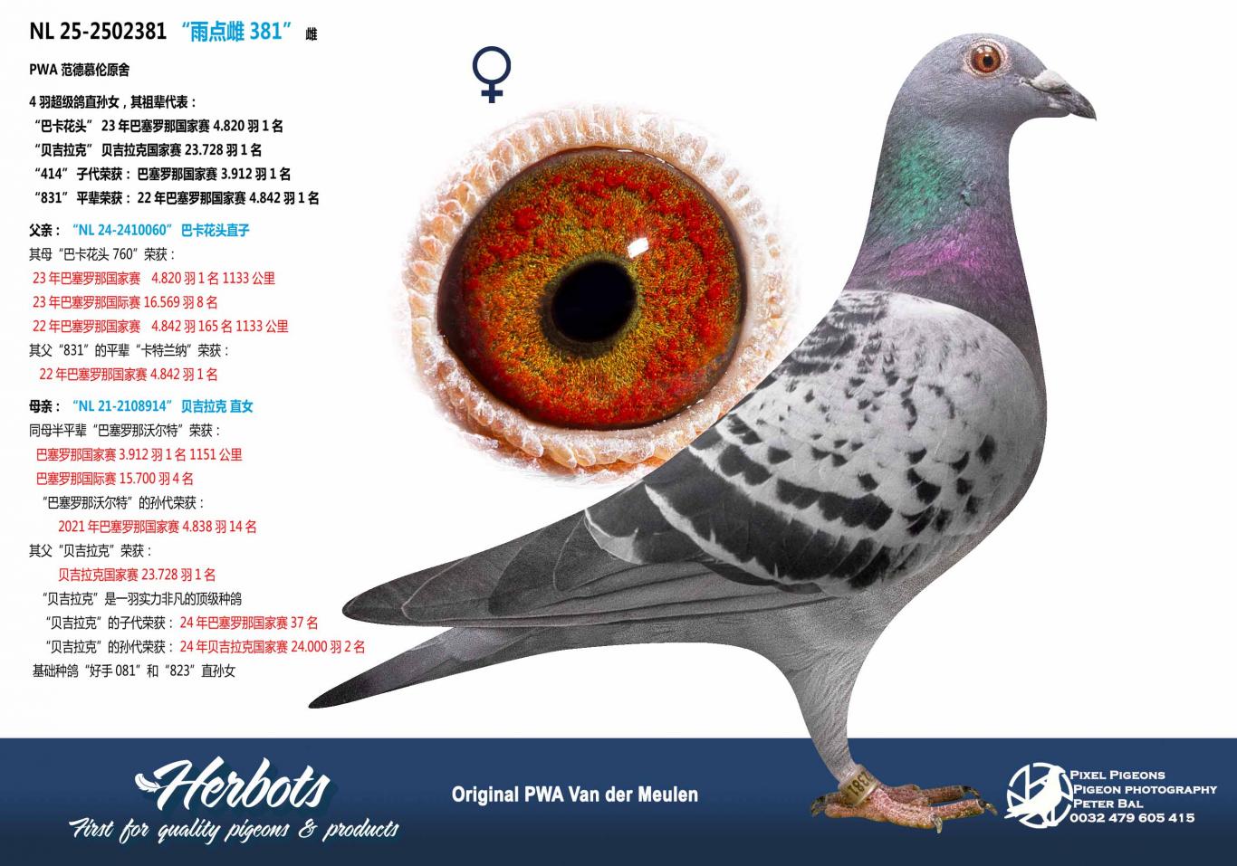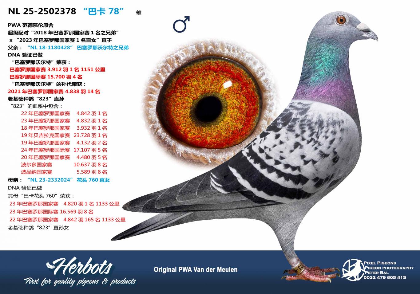 The winner himself, "Bonte 760," also won 165th National Barcelona against 4,832 pigeons in 2022. Her sire is inbred to stock sire "Superkweker 823" and is a grandson of "Crack 61." The dam of "Bonte 760" is a daughter of "116," this super breeding hen is the dam and grandmother of four 1st National winners and was often the regular partner of stock sire "Superkweker 823."