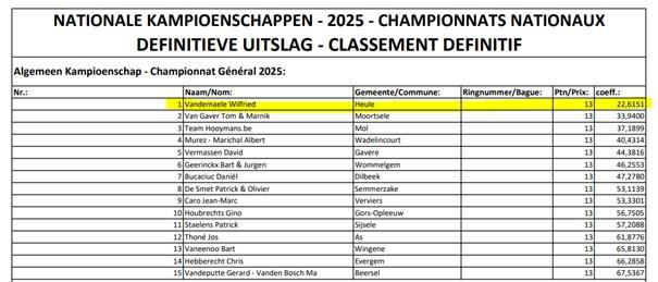 With a lead of more than a wheel, Wilfried and Marie-Christine Vandemaele from Heule secured the title of Belgian KBDB General Champion 2025. It's the most comprehensive championship in Belgium and rewards the racer who, across all distances and disciplines, manages to place their first nominated pigeon as early as possible in the results. A feat in itself, as it's a challenge that begins with the first race of the season and, in many cases, maintains the suspense until the final race. Congratulations are in order!