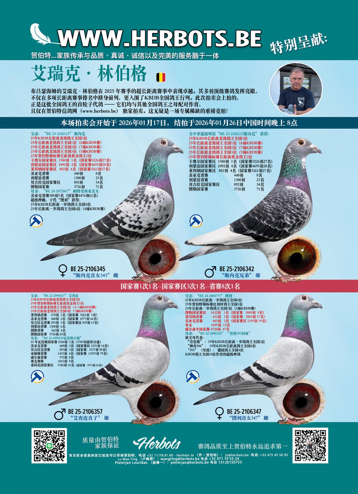 布吕瑟海姆的艾瑞克·林伯格在 2025 年赛季的超长距离赛事中表现卓越。其多羽顶级赛鸽发挥亮眼,不仅在多项长距离赛事排名中跻身前列,更入围了KBDB全国鸽王行列。此次拍卖会上拍的,正是这批全国鸽王的首轮子代鸽 —— 它们均与其他全国鸽王之母配对作育,且仅在贺伯特信鸽网(www.herbots.be) 独家拍卖。这无疑是一场专属稀缺的重磅竞拍!