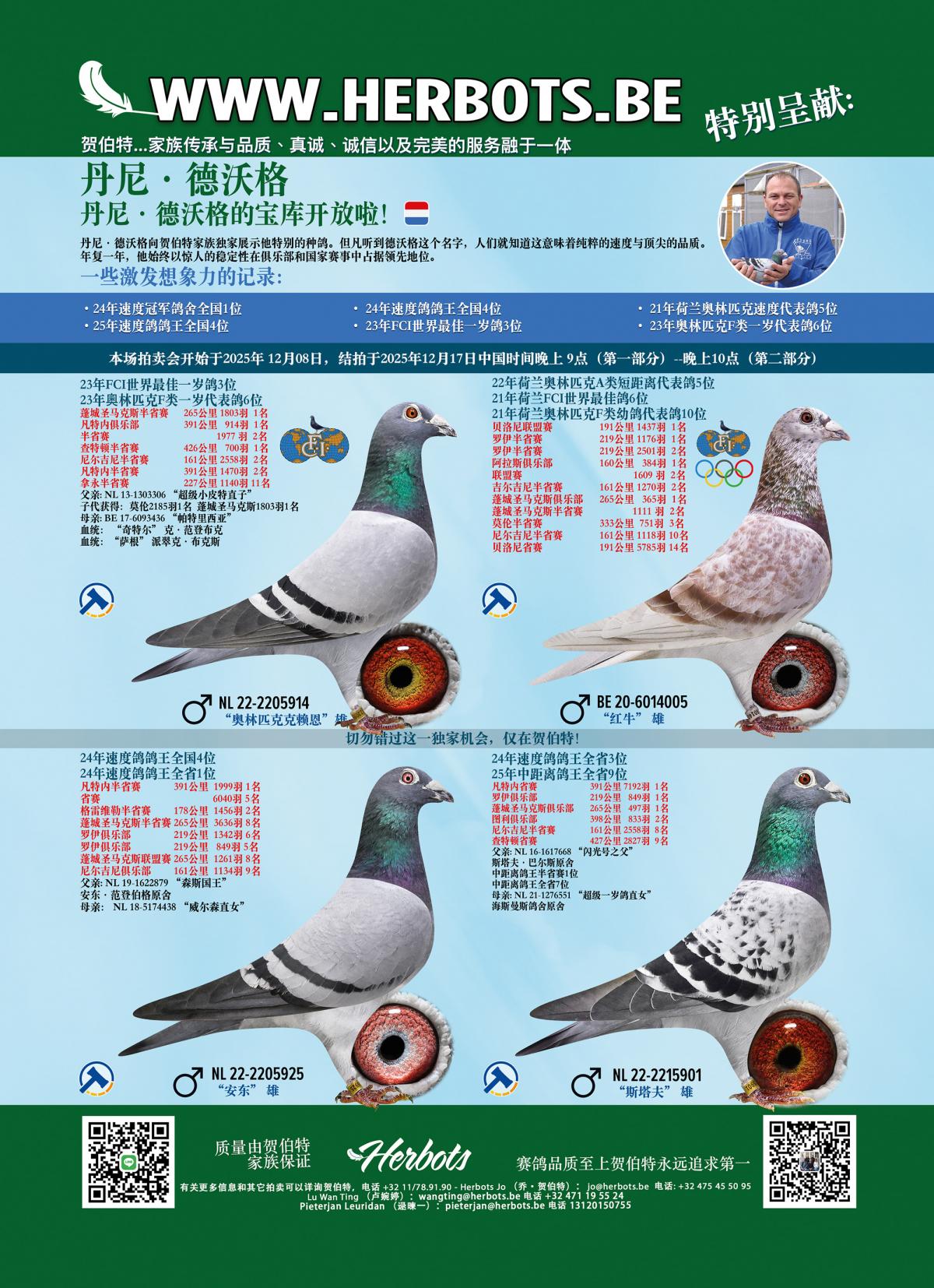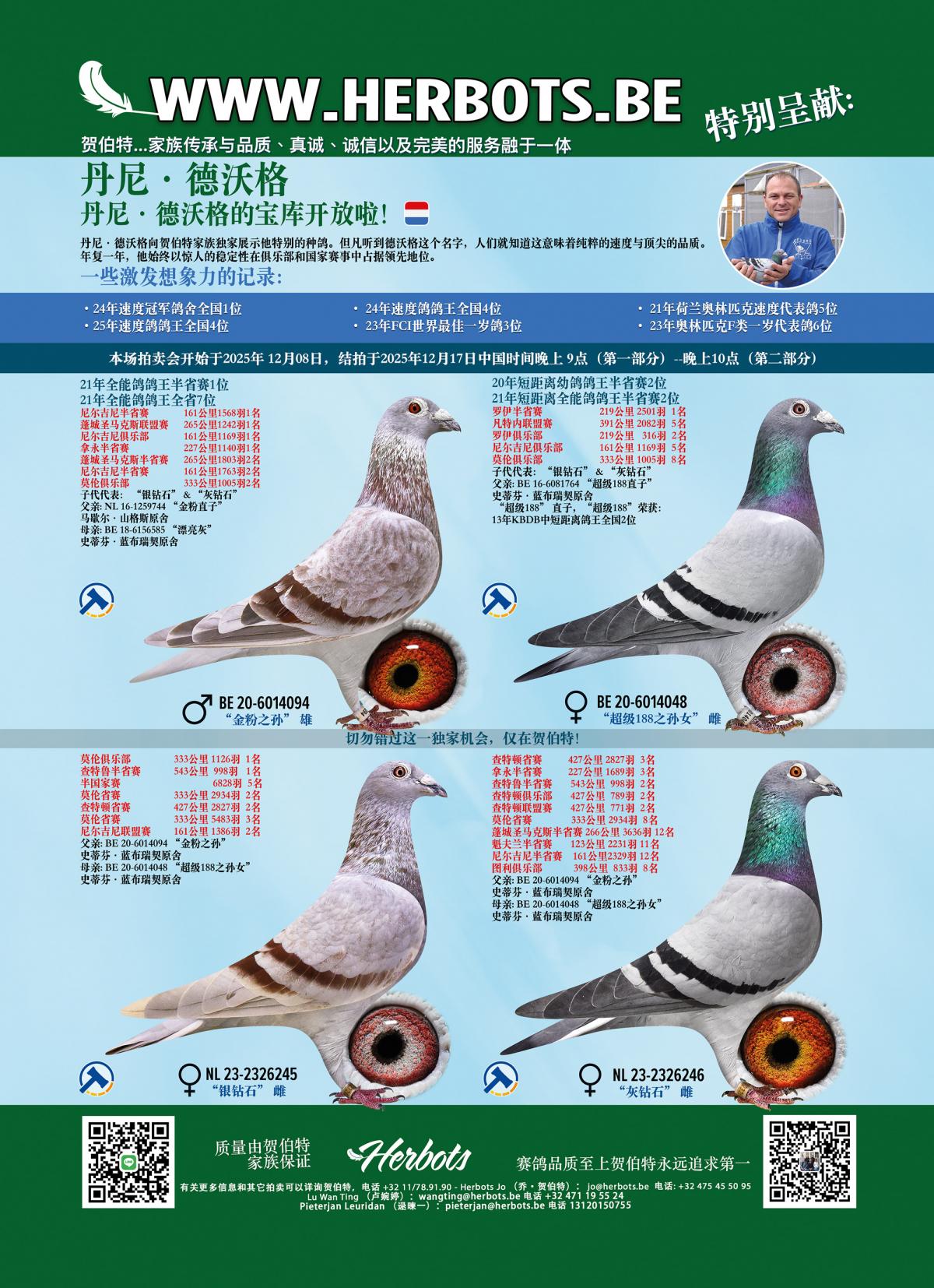 在这场 33 羽赛鸽的拍卖中,压轴珍品将悉数亮相:它们均直接来自其顶级品系,包括:“奥林匹克克赖恩”--“红牛”--“金粉之孙”--“银钻石”--“安东”--“斯特夫”。对于一心只想用最优质种鸽育种的人而言,这无疑是一次获得顶级品质的绝佳机会。”