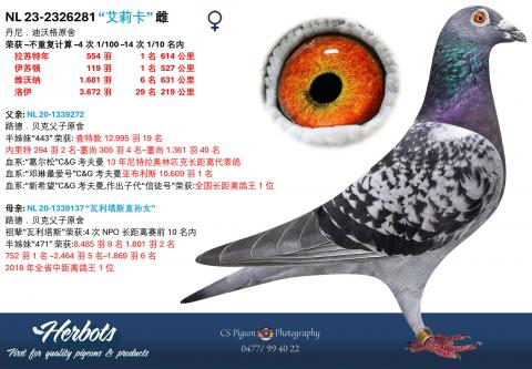 “金粉佳人”出自“好红”,迪克.凡登布克,2013年全国幼鸽鸽王1位 x “奥林匹克罗西塔”,尼特拉奥林匹克1位–全国速度鸽王1位–2012年KBDB全省速度鸽王1位–全国全能鸽王2位–12年KBDB全国速度鸽王4位