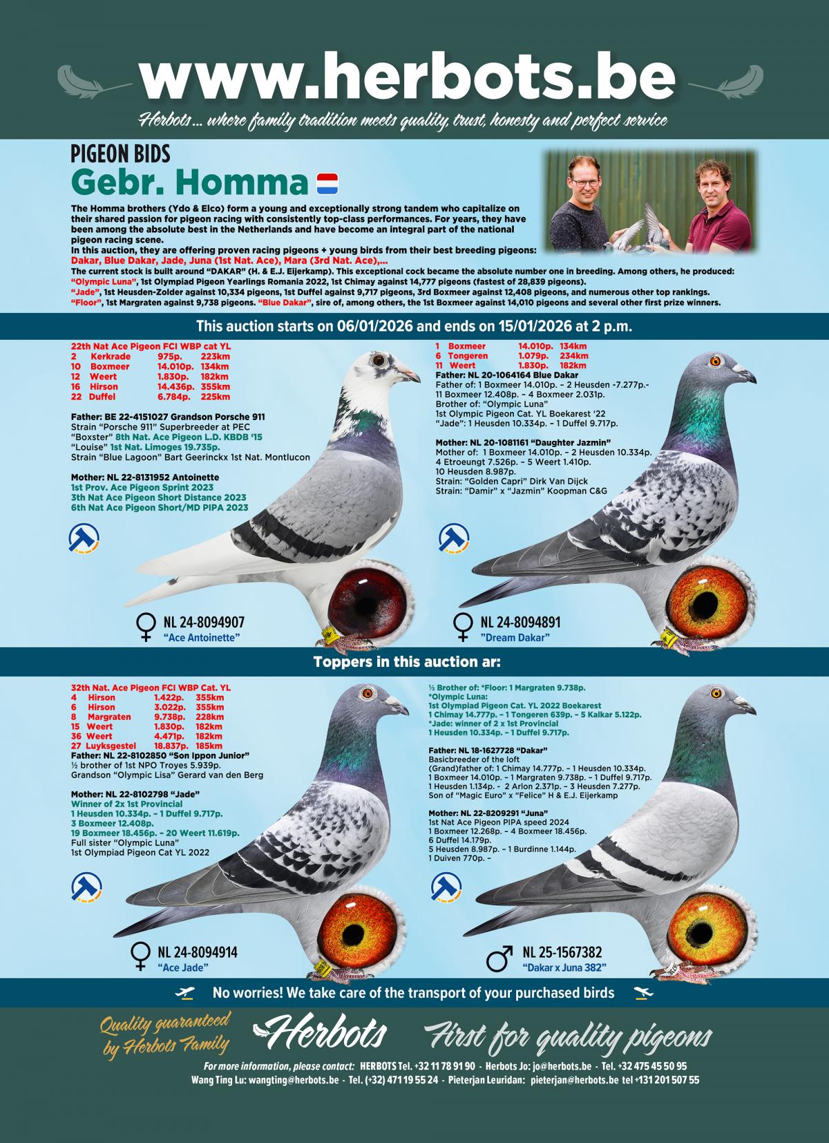 The Homma brothers (Ydo & Elco) form a young and exceptionally strong tandem who capitalize on their shared passion for pigeon racing with consistently top-class performances. For years, they have been among the absolute best in the Netherlands and have become an integral part of the national pigeon racing scene.