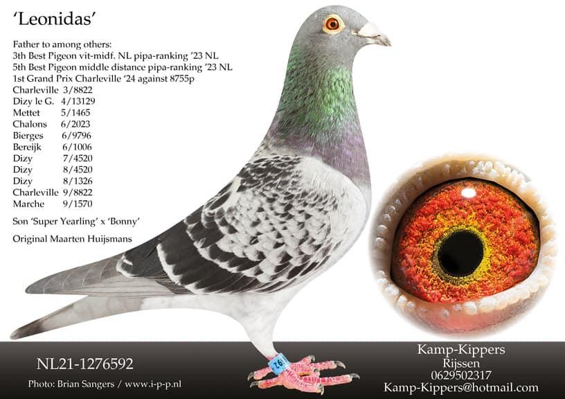 - 3 children of “Leonidas,” including 24-222: Grand Prix winner Charlevilles against 8,886 pigeons. “Leonidas” is the father of the 3rd best pigeon (100-500km) Netherlands 2023 and 5th best pigeon middle distance 2023