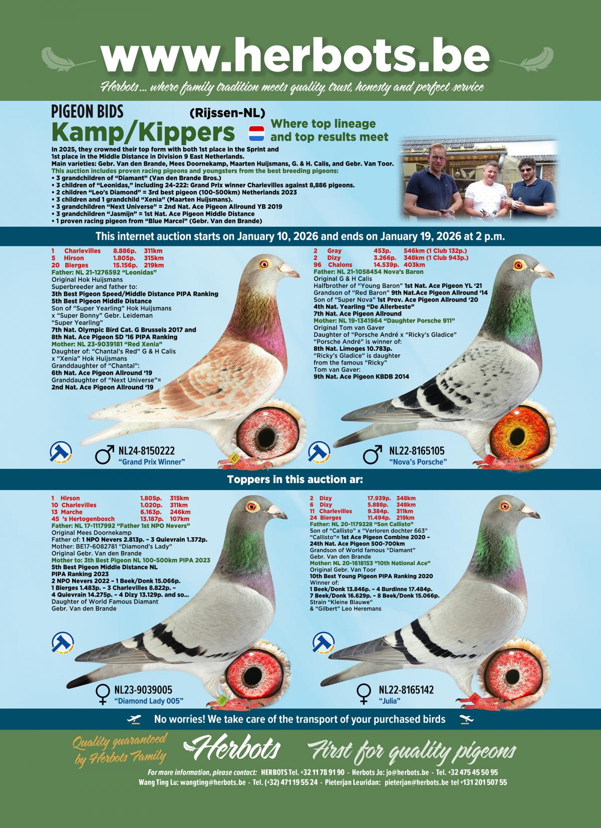 This auction includes proven racing pigeons and youngsters from the best breeding pigeons: