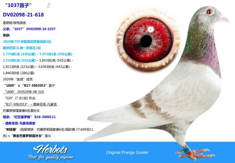 父亲: “1037” DV02098-19-1037荣获: 2020年FCI中距离世界最佳鸽1位奥林匹克G.类一岁鸽王1位1,774羽1名 (338公里) – 7,071羽1名 (356公里) - 2,234羽1名 (542公里)– 5,843羽2名 (542公里) - 1,921羽6名 (223公里) – 3,656羽6名 (443公里) - 1,846羽9名 (286公里)2020年“金鸽”成员“1800” x “B17-3082053”直子“1800” DV02098-08-520 “520”(7 次1名) 作出“B17-3082053” – 德库尼克-凡豪克巴塞罗那国家赛6名直孙女