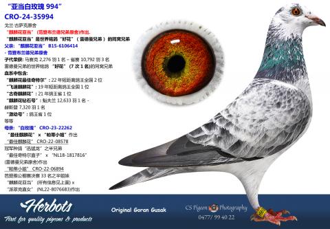 母亲: “白玫瑰” CRO-23-22262 “最佳麒麟花” x “帕蒂小姐”作出“最佳麒麟花” CRO-22-08578冠军种鸽“迅猛龙”之半兄弟“最佳奇特尔直子” x “NL18-1817816”(雷德曼兄弟原舍)作出“帕蒂小姐” CRO-22-06894芭提雅公棚赛决赛33名之半姐妹“麒麟花亚当” (所有信息见上面) x “派翠克直女” (NL22-8076683)作出