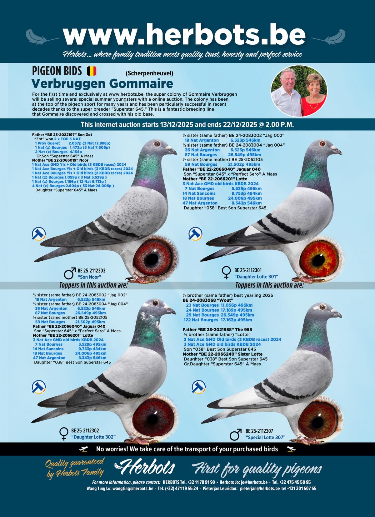 For the first time and exclusively at www.herbots.be, the super colony of Gommaire Verbruggen will be offering several special summer youngsters for sale via an online auction. The colony has been at the top of the pigeon sport for many years and has been particularly successful in recent decades thanks to super breeder "Superstar 645." This is a fantastic breeding line that Gommaire discovered and crossed with his old base.