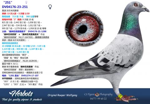令世人瞩目的是,无数鸽友的成功都得益于里波鸽。以艾瑞克·林伯格(Erik Limbourg)为例,他本人坦言,2016年拍卖会上购入的“593号”是他拥有的最佳种雄。若询问雷德曼(Leideman)兄弟对沃尔夫冈・里波鸽的评价,他们说自己的鸽舍中,里波原环种鸽 “梅格那”(Magnus)与“托斯滕”(Torsten)是核心血系。贺伯特兄弟购入的奥林匹克鸽王、全国鸽王“大老板”,也为其带来了巨大成功。近期,乔%弗洛里安・亨里克斯(Jo & Florian Henriks)亦对里波鸽赞不绝口,称其品质“更胜一筹”,其中雌鸽“里波642号”(足环号 DV04176-24-642)极有可能成为新一代基础种雌,引领全球。
