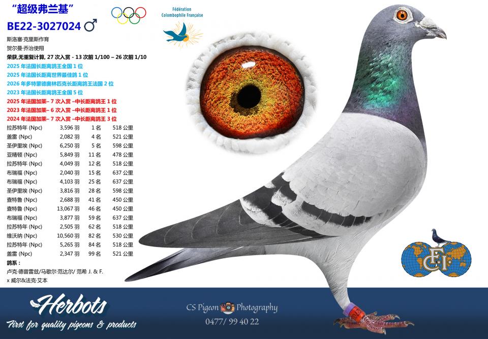2025年法国加莱– 7 次入赏 –中长距离鸽王1位